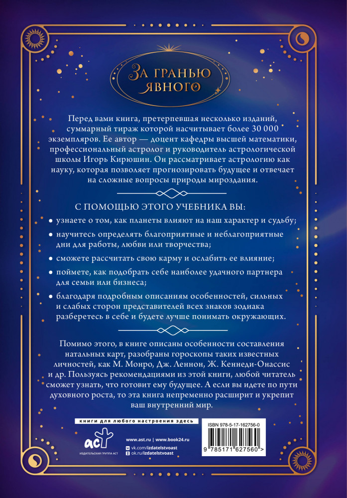 💳 Оплатить за товар можно при получении 🇰🇿 Есть бесплатная доставка по Казахстану от 1 дня 🎁 Копите бонусы с каждой покупки Серия: За гранью явного Перед вами книга, претерпевшая несколько изданий, суммарный тираж которой насчитывает более 30 000 экземпляров. Ее автор — доцент кафедры высшей математики, профессиональный астролог и руководитель астрологической школы Игорь Кирюшин. Он рассматривает астрологию как науку, которая позволяет прогнозировать будущее и отвечает на сложные вопросы природы мироздания. |