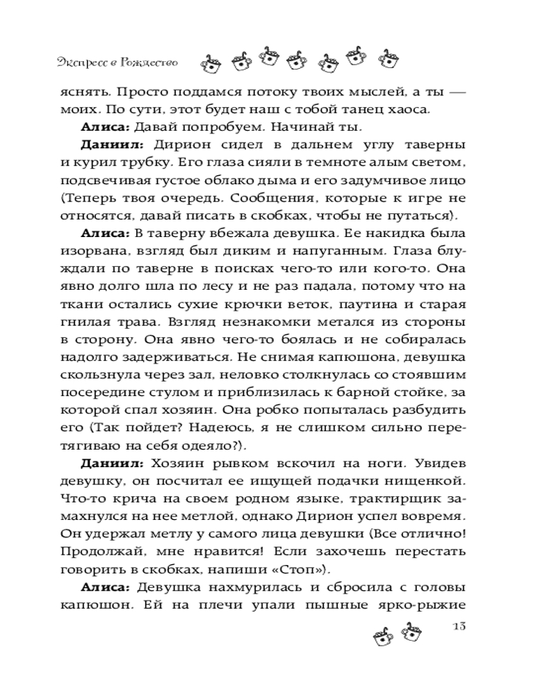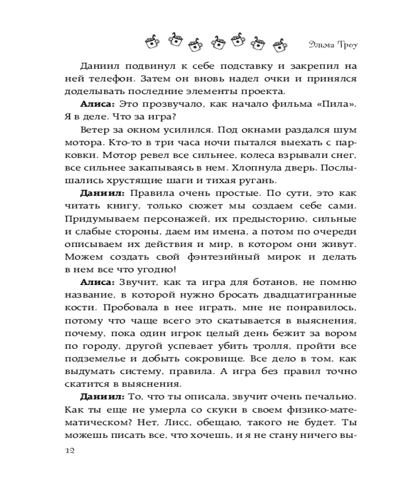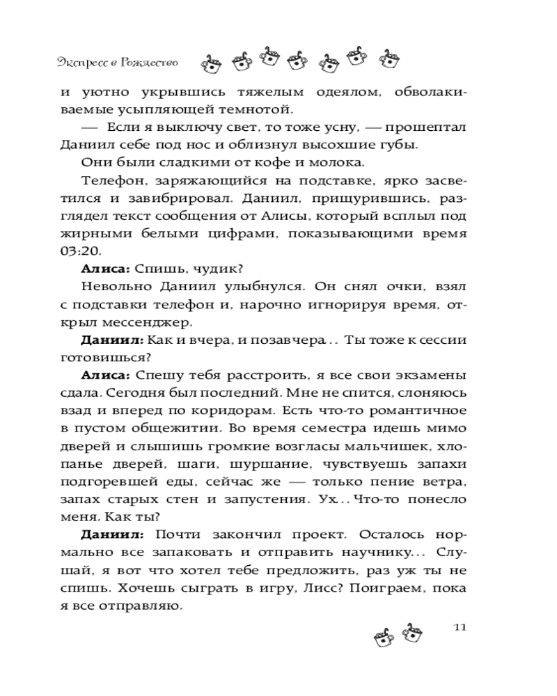 💳 Оплатить за товар можно при получении 🇰🇿 Есть бесплатная доставка по Казахстану от 1 дня 🎁 Копите бонусы с каждой покупки Серия: Зимняя романтика Алиса — давняя подруга Даниила по переписке. Вместе они играют в текстовую ролевую игру, создавая вокруг себя свой идеальный фэнтези-мир. Их общение похоже на романтическое приключение, в котором они могут спасать друг друга, путешествовать — и воплощать свои самые сокровенные фантазии. Живя в одном городе, в Москве, они никогда не виделись вживую. Алиса влюблена в Даниила, но боится быть отвергнутой и потерять единственного близкого по духу человека. Юноша испытывает теплые чувства к девушке, но не может разобраться, страсть это или любовь. Герои встречаются во время рождественского путешествия на винтажном поезде. Им предстоит узнать друг друга заново и понять: есть ли между ними что-то вне их вымышленного фэнтези-мирка, или их чувства лишь порождение воображения? |