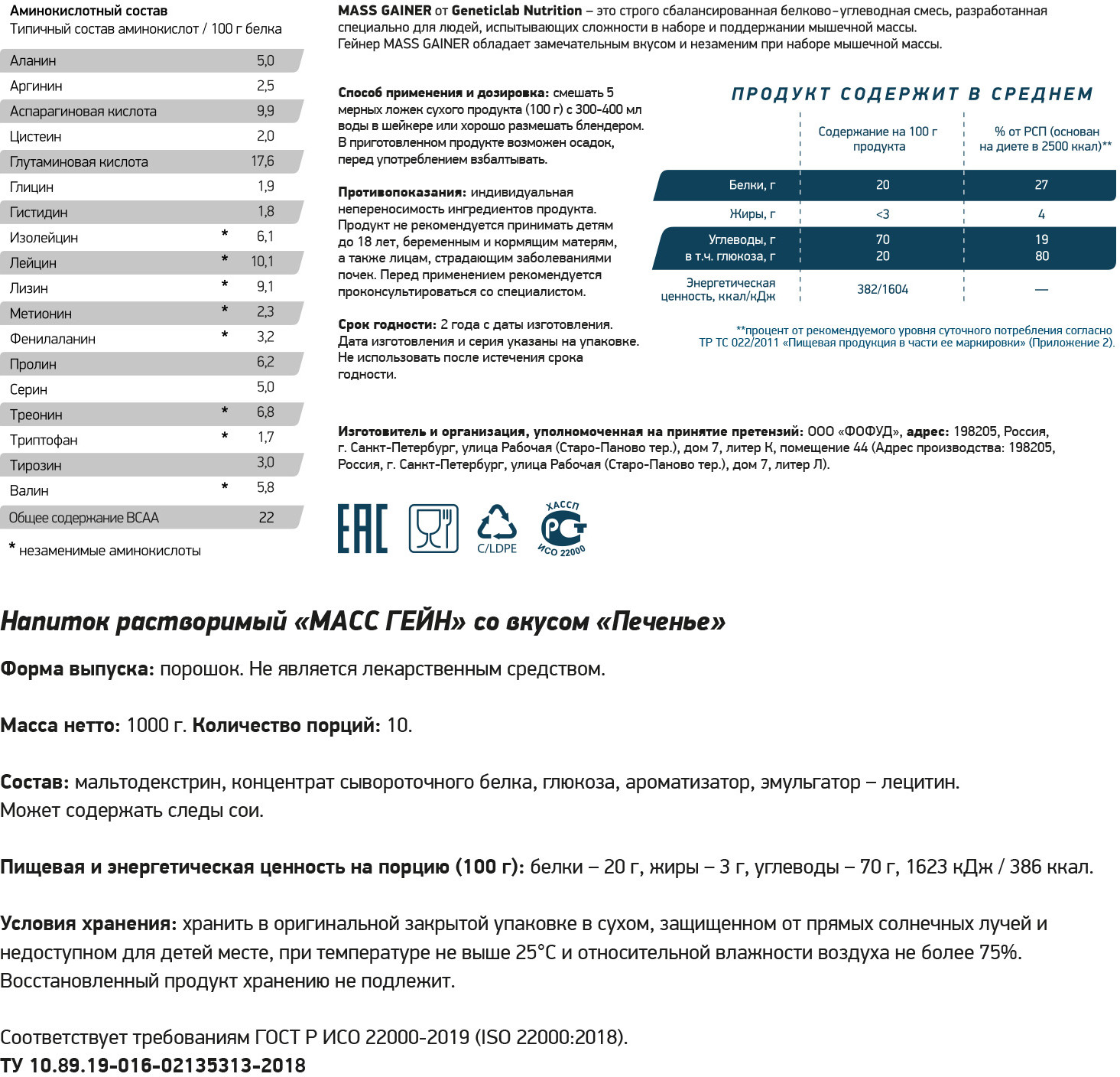 Высококалорийный гейнер Mass Gainer от Geneticlab предназначен для питания профессиональных спортсменов, а также для тех, кто набирает массу. Соотношение углеводов к белку в нем равно 3:1. С каждой порцией вы обеспечите потребность организма в 20 граммах белка и 72 граммах углеводов (в зависимости от выбранного вкуса данные показатели могут отличаться, см. на упаковке). Белок необходим для поддержания процессов по построению и наращиванию мышечной массы, углеводы — для восстановления гликогеновых запасов и энергетических потребностей. Вместе они поддержат оптимальное восстановление организма. Белковая составляющая — это сывороточный концентрат, углеводная часть — это мальтодекстрин. Потребляя данный гейнер, вы поддержите чувство сытости длительное время.