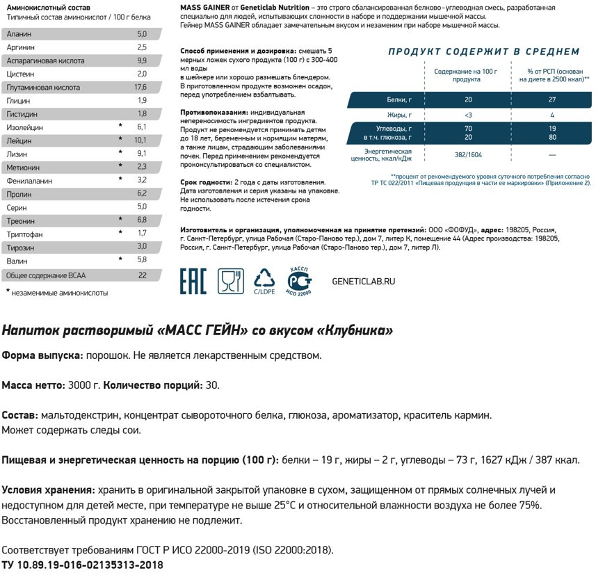 Высококалорийный гейнер Mass Gainer от Geneticlab предназначен для питания профессиональных спортсменов, а также для тех, кто набирает массу. Соотношение углеводов к белку в нем равно 3:1. С каждой порцией вы обеспечите потребность организма в 20 граммах белка и 72 граммах углеводов (в зависимости от выбранного вкуса данные показатели могут отличаться, см. на упаковке). Белок необходим для поддержания процессов по построению и наращиванию мышечной массы, углеводы — для восстановления гликогеновых запасов и энергетических потребностей. Вместе они поддержат оптимальное восстановление организма. Белковая составляющая — это сывороточный концентрат, углеводная часть — это мальтодекстрин. Потребляя данный гейнер, вы поддержите чувство сытости длительное время.