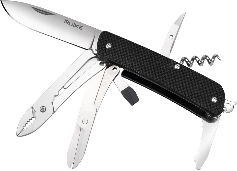 Рукоять выполнена из прочного материала G10 черного цвета, обеспечивающего надежный и комфортный хват. Вес ножа составляет 158 г, что делает его легким и удобным для ношения. Дополнительные инструменты включают пилу по дереву, открывалку для бутылок, консервный нож, отвертки, штопор и стеклобой, что расширяет функциональность ножа и позволяет использовать его в различных ситуациях. Этот нож отличается эргономичным дизайном и высоким качеством сборки, что делает его отличным выбором для тех, кто ценит надежность и универсальность в одном инструменте.