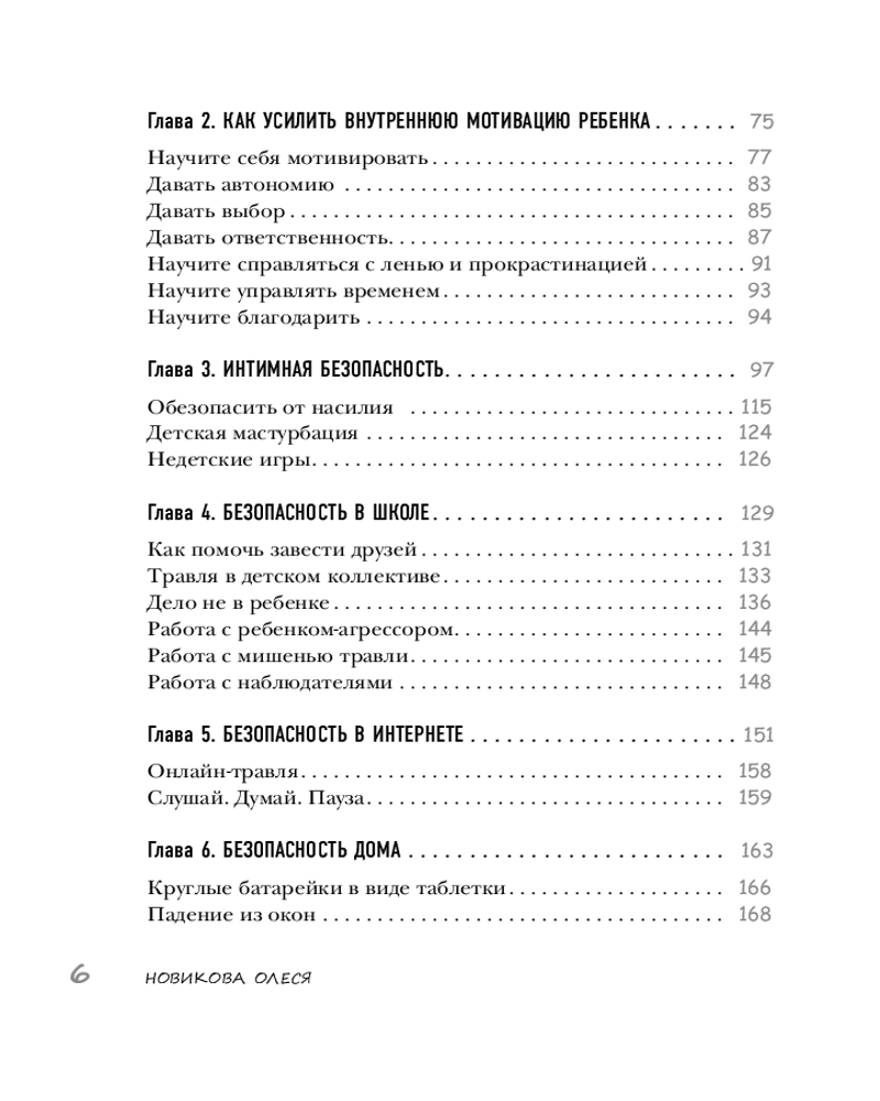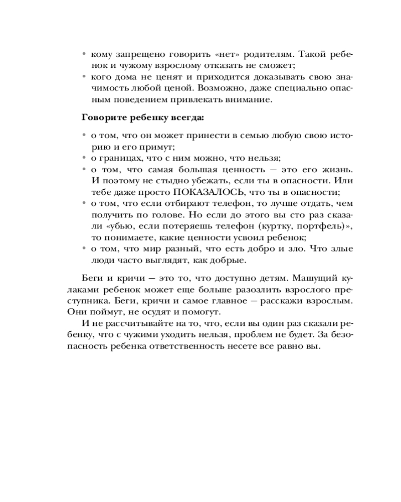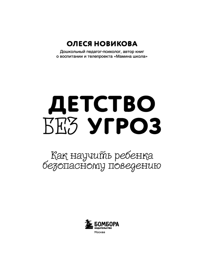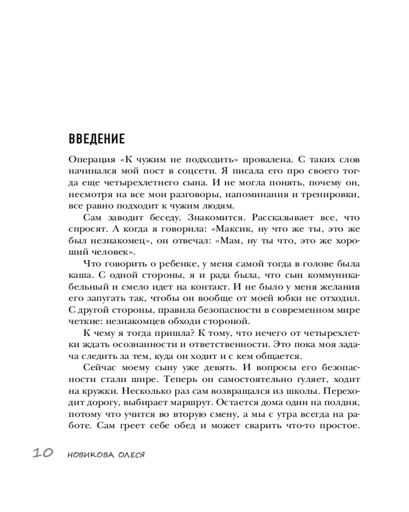Серия: Детям про безопасность Эта книга — настоящий путеводитель для родителей, стремящихся вырастить уверенных и счастливых детей. Автор книги, Олеся Новикова, педагог, психолог и автор масштабного телепроекта «Мамина школа», предлагает детально разобрать тему детской безопасности, начиная с эмоционального благополучия в семье и предотвращения угроз психологическому здоровью ребенка, переходя к темам интимной безопасности и правилам поведения в школе, на улице, дома и в интернете.
