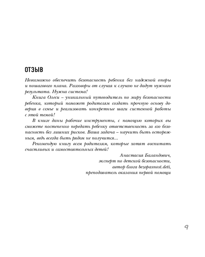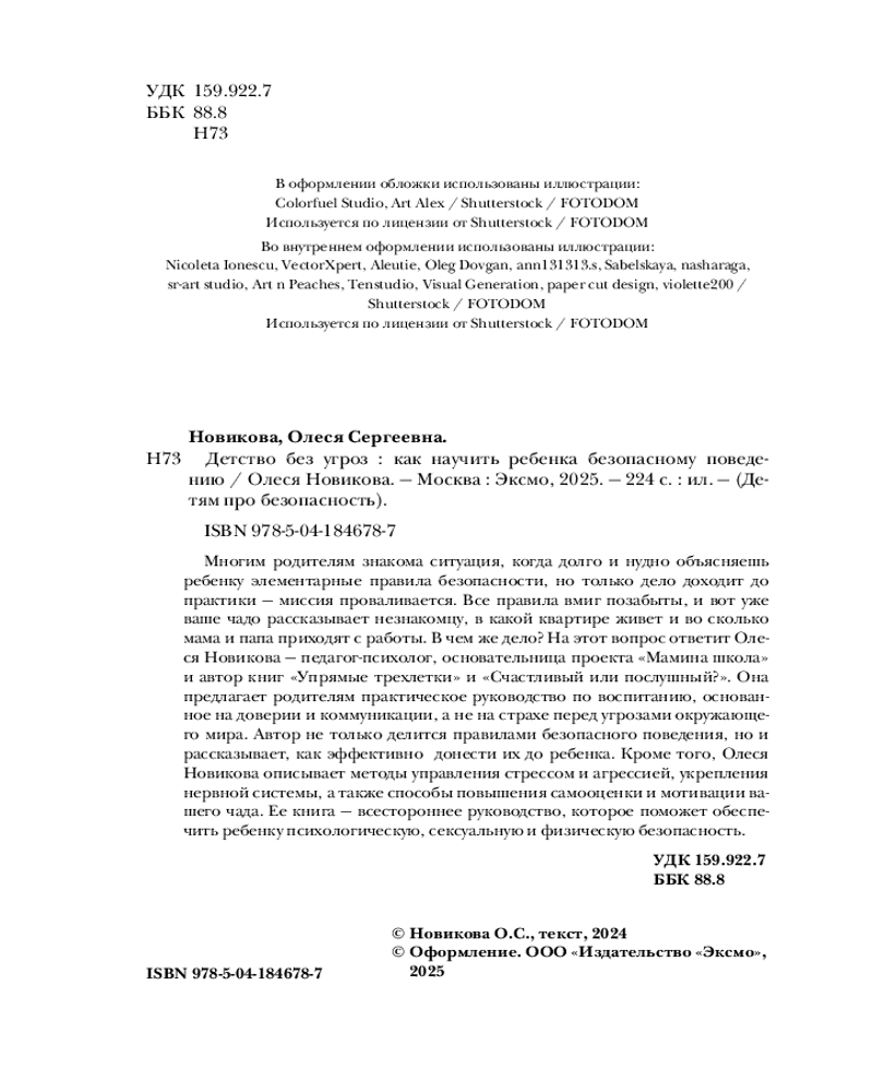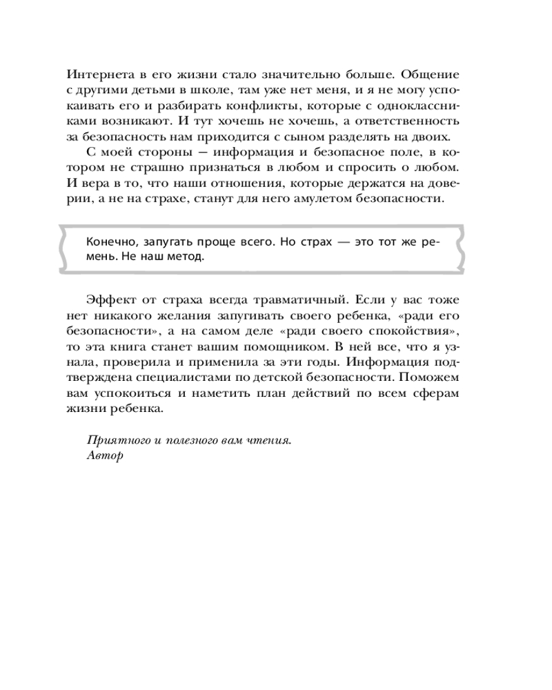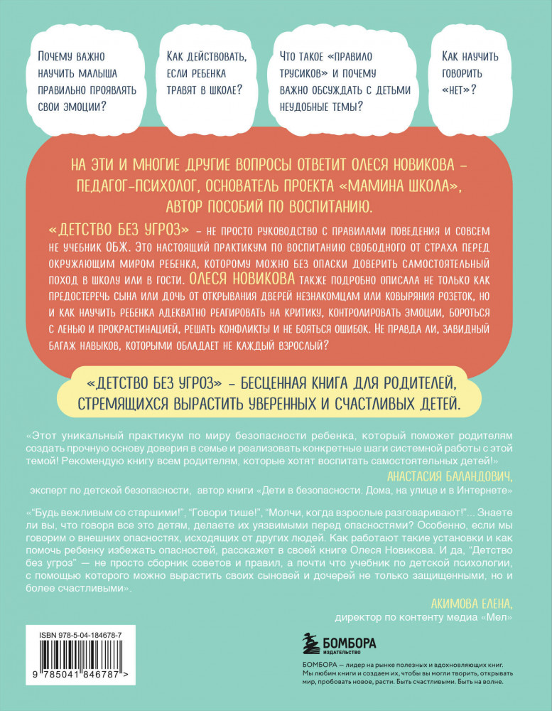 Серия: Детям про безопасность Эта книга — настоящий путеводитель для родителей, стремящихся вырастить уверенных и счастливых детей. Автор книги, Олеся Новикова, педагог, психолог и автор масштабного телепроекта «Мамина школа», предлагает детально разобрать тему детской безопасности, начиная с эмоционального благополучия в семье и предотвращения угроз психологическому здоровью ребенка, переходя к темам интимной безопасности и правилам поведения в школе, на улице, дома и в интернете.