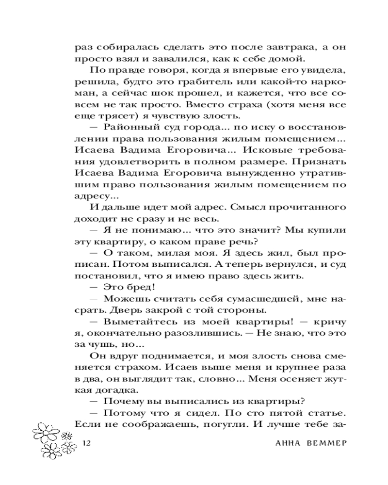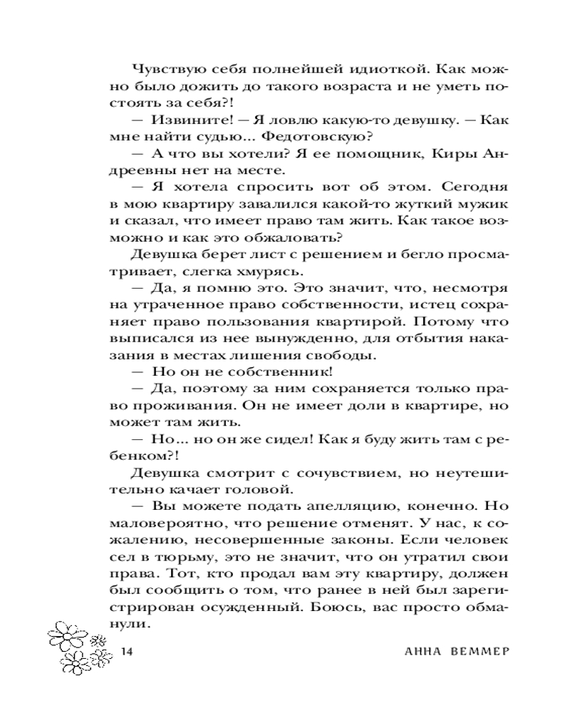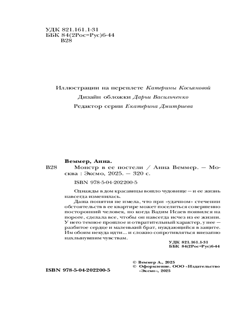 💳 Оплатить за товар можно при получении 🇰🇿 Есть бесплатная доставка по Казахстану от 1 дня 🎁 Копите бонусы с каждой покупки Серия: За шаг до любви. Романы Анны Веммер Книги Анны Веммер — новое слово в жанре современной сентиментальной прозы. Каждый роман автора — это трогательная история о семейных ценностях, дружбе и любви. Однажды в дом красавицы вошло чудовище — и ее жизнь навсегда изменилась. Даша понятия не имела, что при «удачном» стечении обстоятельств в ее квартире может поселиться совершенно посторонний человек, но когда Вадим Исаев появился на пороге, сделала все, чтобы он навсегда исчез из ее жизни. У него темное прошлое и отвратительный характер, у нее — разбитое сердце и маленький брат, нуждающийся в защите. Им обоим некуда идти... и сложно сопротивляться внезапно нахлынувшим чувствам. |