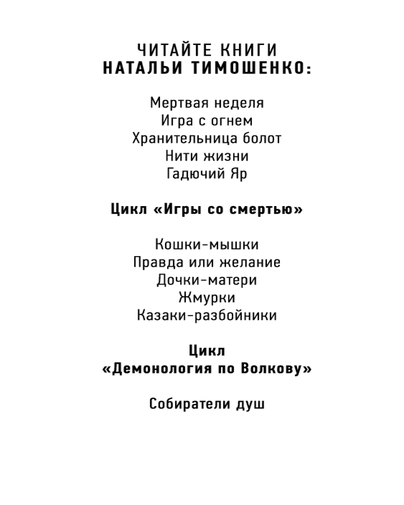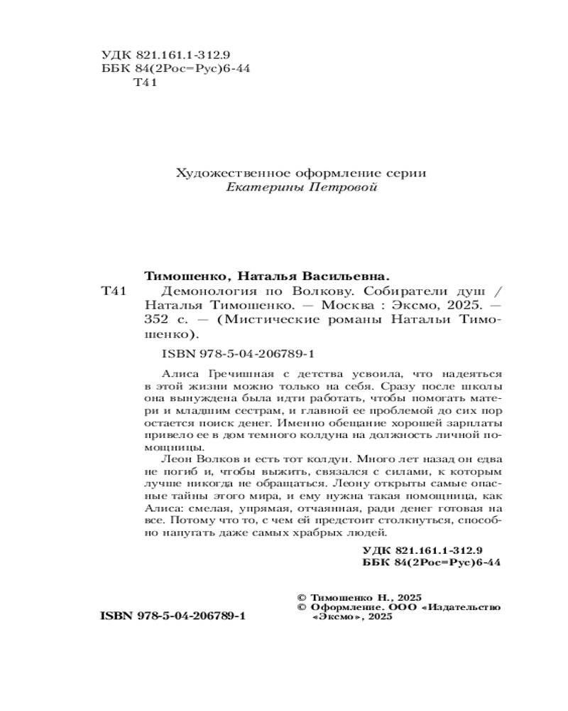 💳 Оплатить за товар можно при получении 🇰🇿 Есть бесплатная доставка по Казахстану от 1 дня 🎁 Копите бонусы с каждой покупки Серия: Мистические романы Натальи Тимошенко Новинка от признанного мастера мистического романа Натальи Тимошенко. Первая книга в новом мистическом цикле «Демонология по Волкову». Темному магу Леону Волкову и его новой помощнице Алисе Гречишной предстоит столкнуться с самыми пугающими существами из потустороннего и одолеть их. Смогут ли они справиться? Ведь силы не всегда равны... |