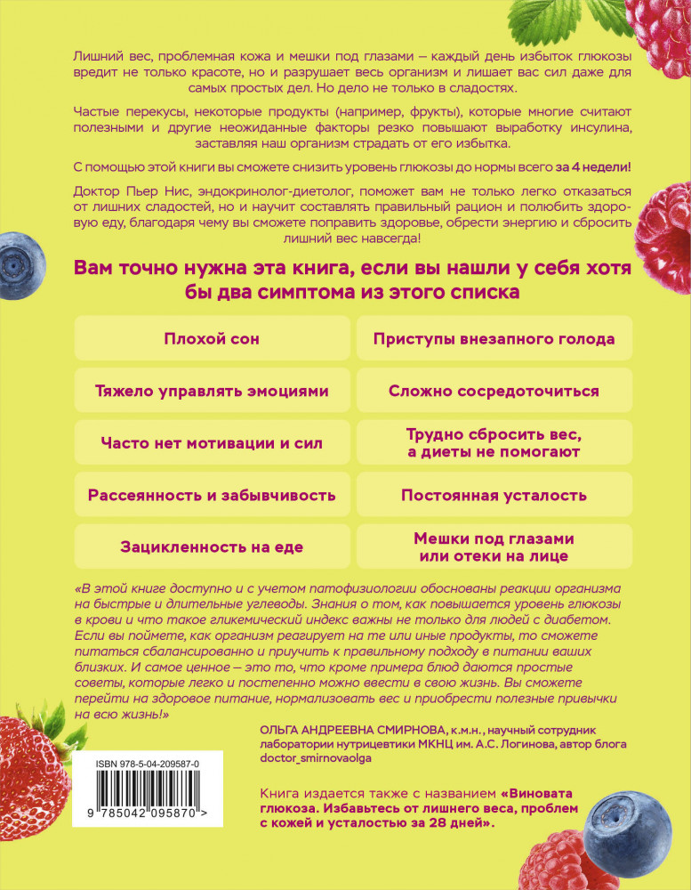«В этой книге доступно и с учетом патофизиологии обоснованы реакции организма на быстрые и длительные углеводы. Знания о том, как повышается уровень глюкозы в крови и что такое гликемический индекс, важны не только для людей с диабетом. Если вы поймете, как организм реагирует на те или иные продукты, то сможете питаться сбалансированно и приучить к правильному подходу в питании ваших близких. И самое ценное — это то, что кроме примера блюд даются простые советы, которые легко и постепенно можно ввести в свою жизнь. Вы сможете перейти на здоровое питание, нормализовать вес и приобрести полезные привычки на всю жизнь!» — Ольга Андреевна Смирнова, к.м.н., научный сотрудник лаборатории нутрицевтики МКНЦ им. А.С. Логинова, автор блога doctor_smirnovaolga |
