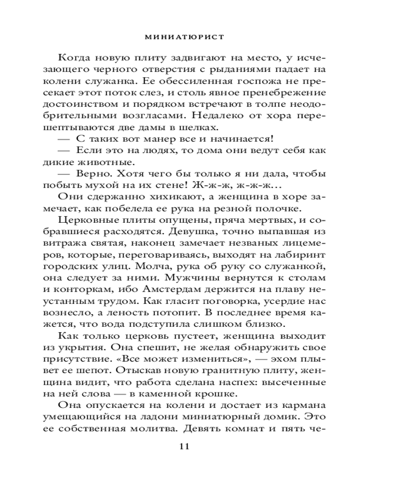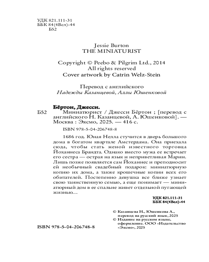 Серия: Loft. Джесси Бёртон 1686 год. Юная Нелла стучится в дверь большого дома в богатом квартале Амстердама. Она приехала сюда, чтобы стать женой известного торговца Йоханнеса Брандта. Однако вместо мужа ее встречает его сестра — острая на язык и неприветливая Марин. Лишь позже появляется сам Йоханнес и преподносит ей необычный свадебный подарок: миниатюрную копию их дома, а также крошечные копии всех его обитателей. Постепенно девушка все ближе узнает свою таинственную семью, а еще понимает — миниатюрный дом в ее спальне живет отдельной пугающей жизнью... |