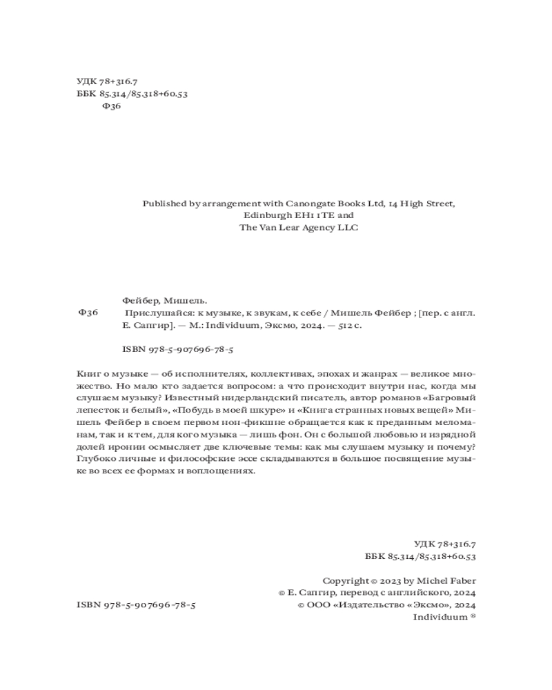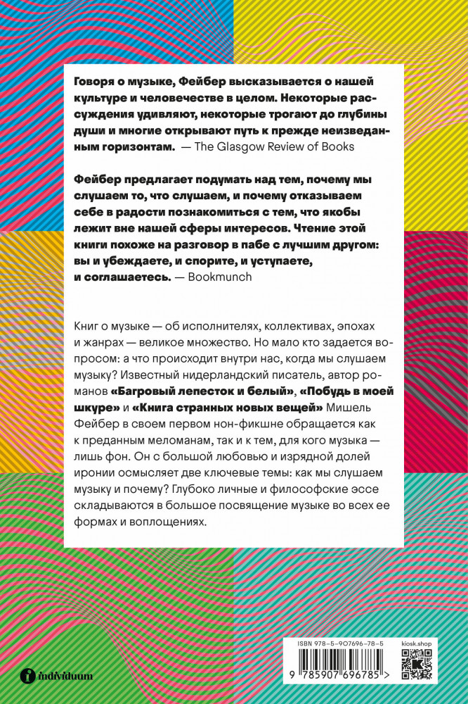 💳 Оплатить за товар можно при получении 🇰🇿 Есть бесплатная доставка по Казахстану от 1 дня 🎁 Копите бонусы с каждой покупки Книг о музыке — об исполнителях, коллективах, эпохах и жанрах — великое множество. Но мало кто задается вопросом: а что происходит внутри нас, когда мы слушаем музыку? Известный нидерландский писатель, автор романов «Багровый лепесток и белый», «Побудь в моей шкуре» и «Книга странных новых вещей» Мишель Фейбер в своем первом нон-фикшене обращается как к преданным меломанам, так и к тем, для кого музыка — лишь фон. Он с большой любовью и изрядной долей иронии осмысляет две ключевые темы: как мы слушаем музыку и почему? Глубоко личные и философские эссе складываются в большое посвящение музыке во всех ее формах и воплощениях. |