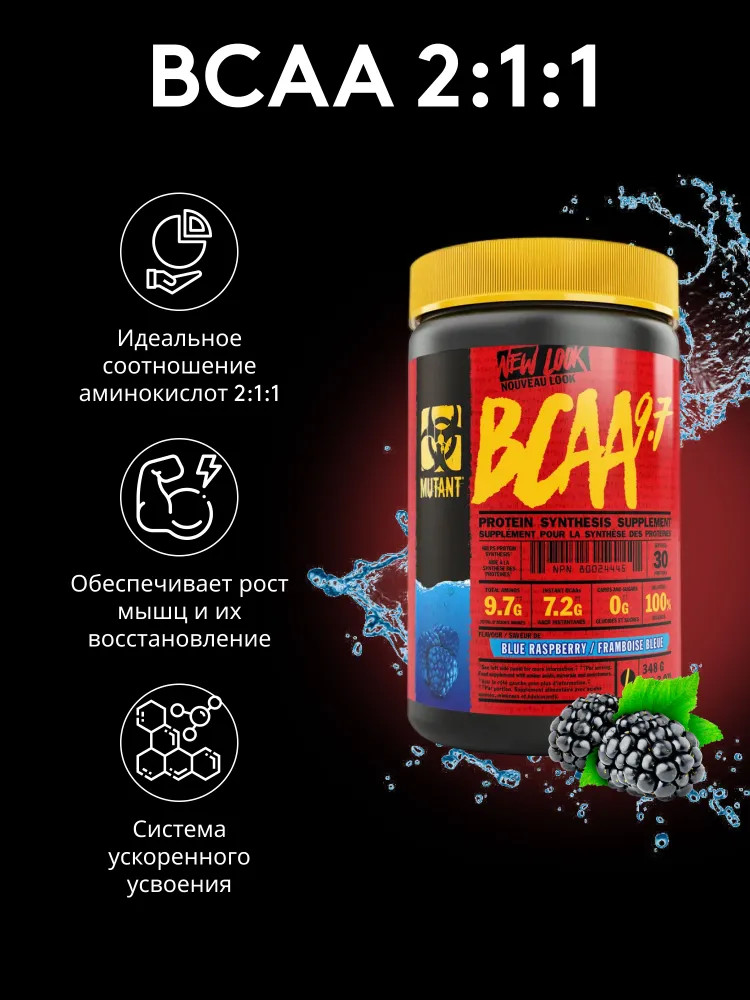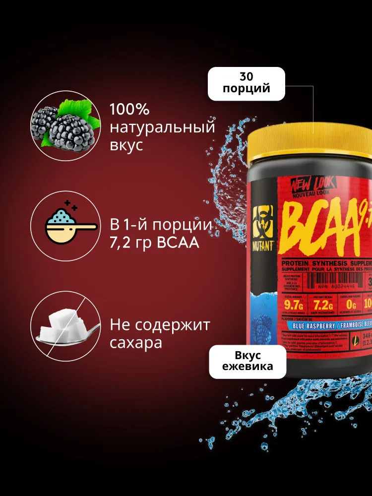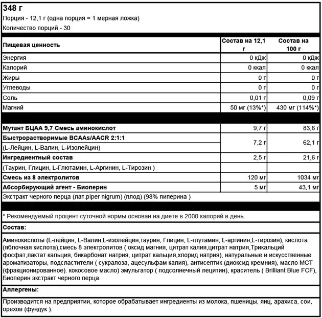 • 9.7 грамм аминокислот, из которых 7.2 г приходится на BCAA;