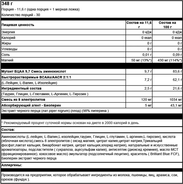 Л-лейцин, Л-валин, Л-изолейцин, таурин, глицин, L-глутамин, L-аргинин, L-тирозин, оксид магния, цитрат калия, цитрат натрия, трикальцийфосфат, лактат кальция, бикарбонат натрия, цитрат кальция, хлорид натрия, яблочная кислота, ацесульфам калия, сукралоза, диоксид кремния, краситель, соевый лецитин, натуральный и искусственные ароматизаторы.