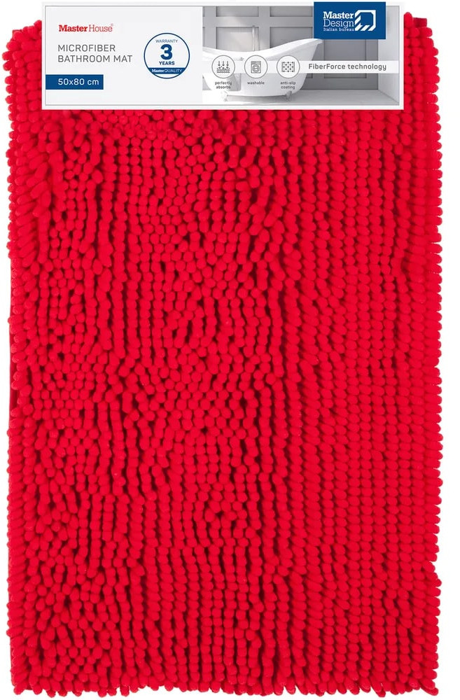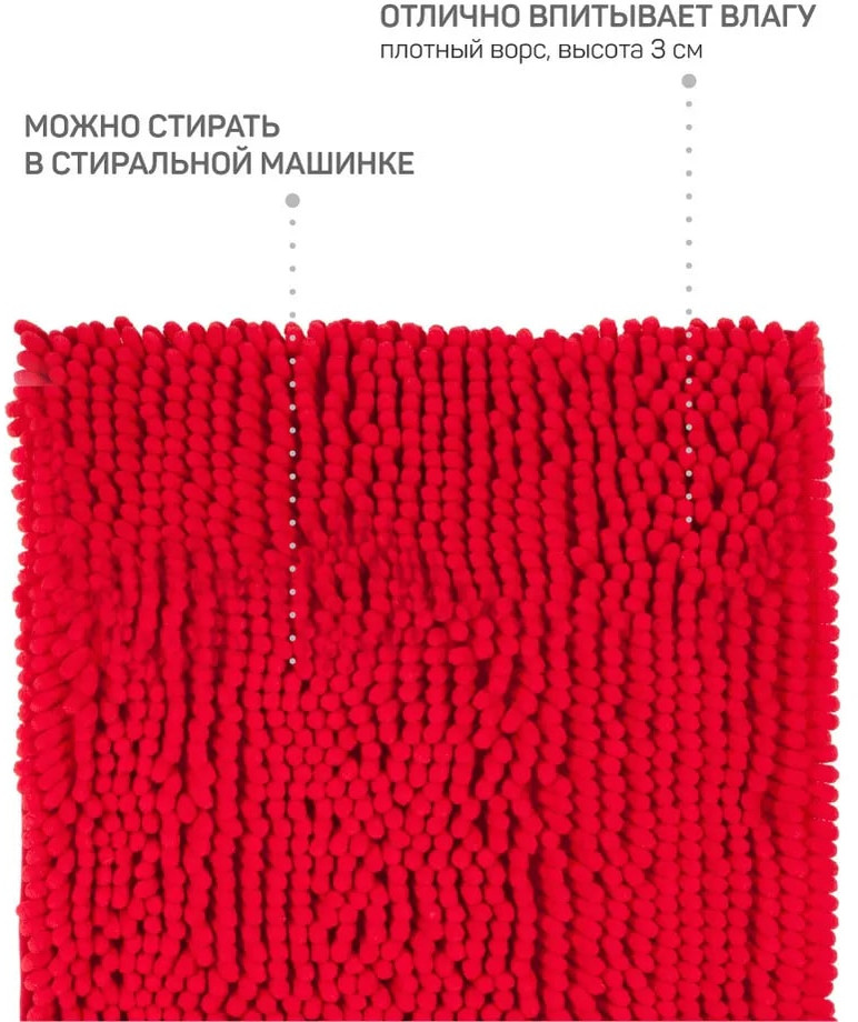 Стильный большой красный коврик для ванной комнаты Брейди прямоугольной формы из мягкой микрофибры высотой 3см не скользит на кафеле, керамограните, линолеуме и других напольных поверхностях и не боится пола с подогревом. Ковёр в ванную имеет оптимальный размер 50×80см для душевой, как прикроватный, у дивана под ноги или в детскую. Быстросохнущий, влаговпитывающий материал обеспечивает комфорт и легкий массажный эффект для ног после принятия душа и ванны. Настоящий антистресс — зарыться в мягкий ворс.