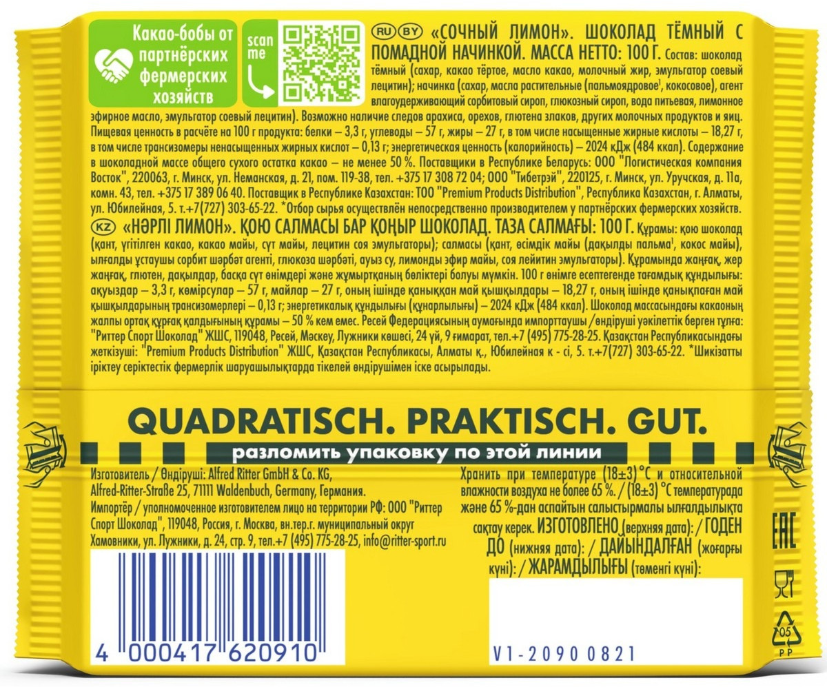 Ritter Sport Шоколад темный с помадной начинкой «Сочный лимон»