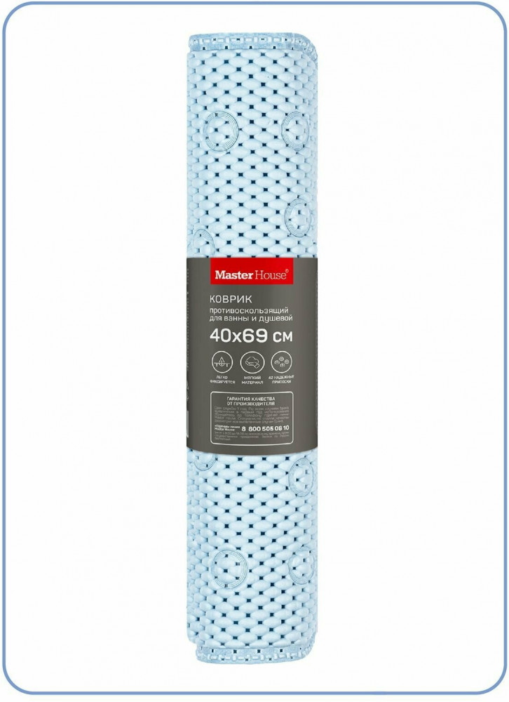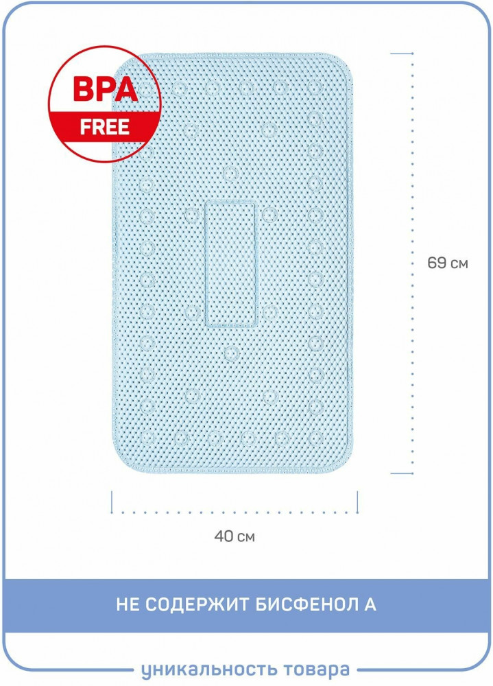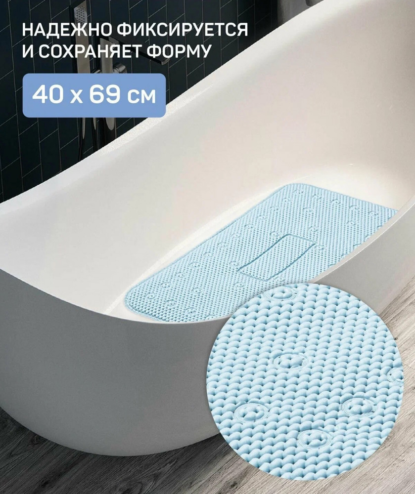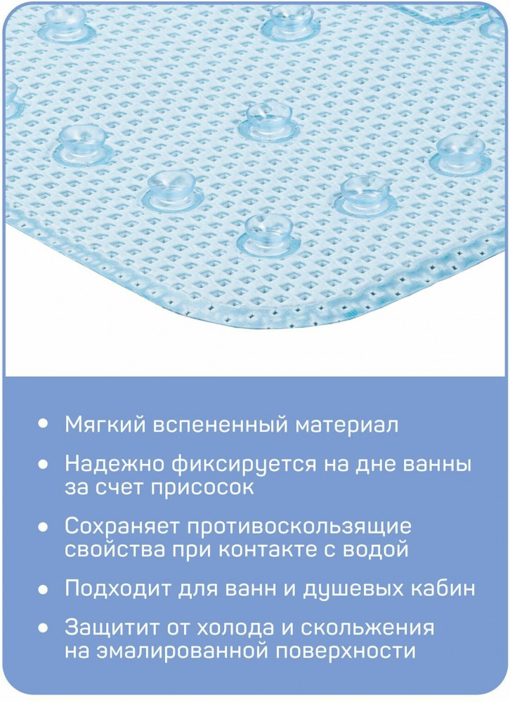 Противоскользящий мягкий коврик из вспененного ПВХ для душевой и ванны с легким массажным эффектом. Размер позволяет разместить его в любой чаше ванной. Подойдет для всех типов чаш, включая акриловую. 42 присоски на обратной стороне резинового коврика в ванную обеспечат надежную фиксацию на поверхности и уберегут от падений детей, пожилых людей и взрослых. Очень мягкий и нежный, взбодрит утром и расслабит уставшие ноги после рабочего дня вечером.