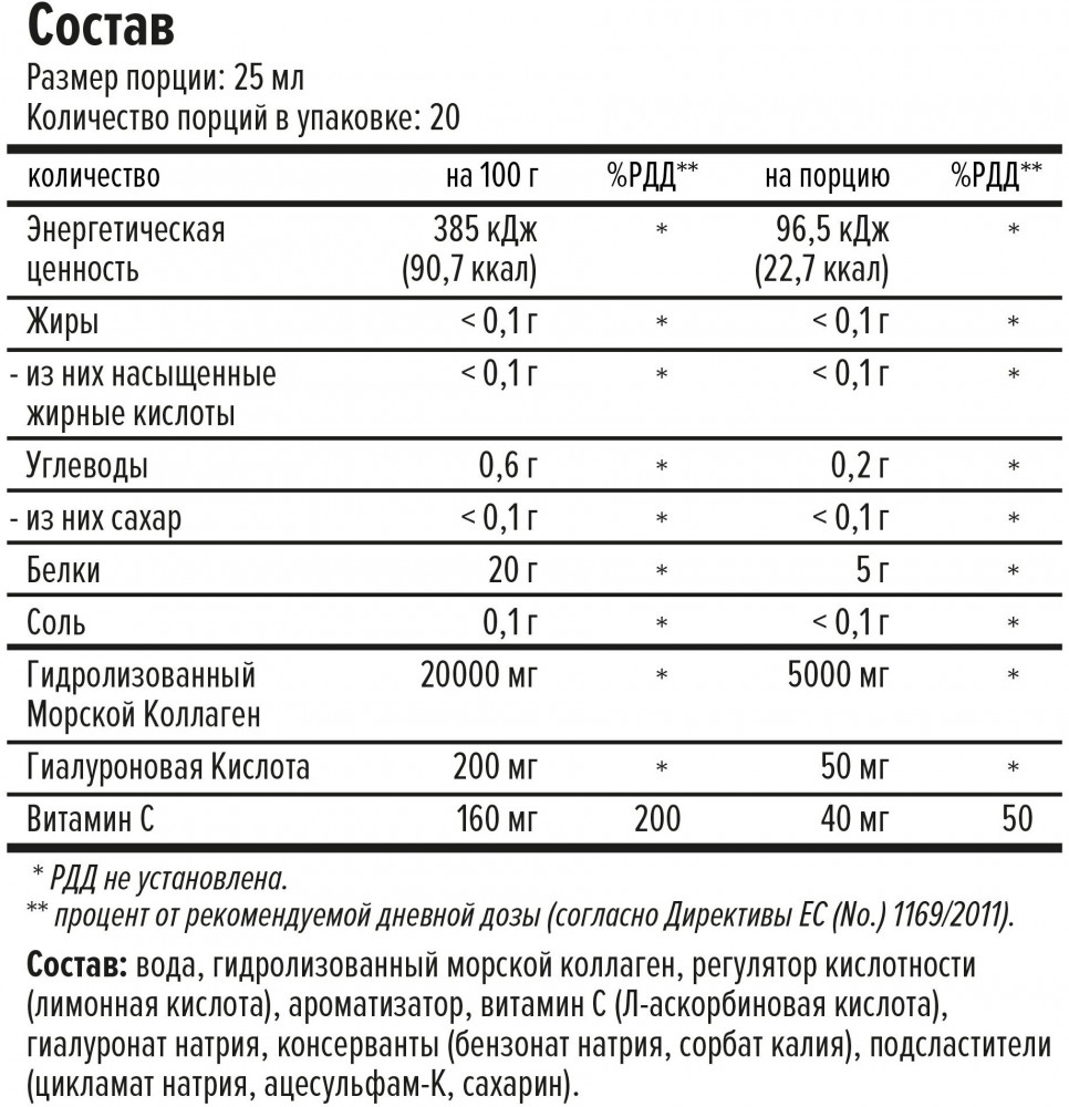 Вода, гидролизованный морской коллаген 5000 мг, лимонная кислота, ароматизатор, витамин С 40 мг, гиалуронат натрия - 50 мг, консервирующие агенты (бензонат натрия, сорбат калия), подсластители.