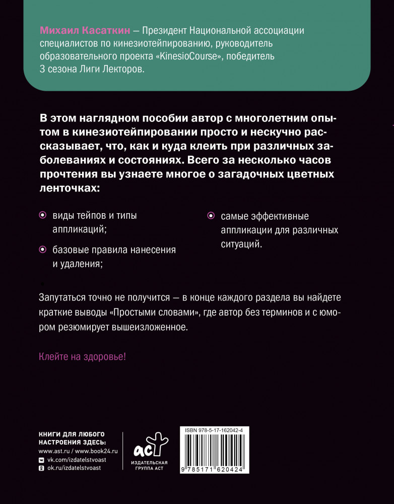 💳 Оплатить за товар можно при получении 🇰🇿 Есть бесплатная доставка по Казахстану от 1 дня 🎁 Копите бонусы с каждой покупки Серия: Доктор блогер Михаил Касаткин — президент Национальной ассоциации специалистов по кинезиотейпированию, руководитель образовательного проекта «KinesioCourse», победитель 3 сезона Лиги Лекторов. |