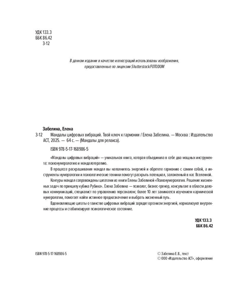 💳 Оплатить за товар можно при получении 🇰🇿 Есть бесплатная доставка по Казахстану от 1 дня 🎁 Копите бонусы с каждой покупки Серия: Мандалы для релакса «Мандалы цифровых вибраций» — уникальная книга, которая объединила в себе два мощных инструмента: психонумерологию и мандалотерапию. В процессе раскрашивания мандал вы наполнитесь энергией и обретете гармонию с самим собой, а инструменты нумерологии и психологические техники помогут раскрыть потенциал, заложенный в нас Вселенной. Контуры мандал сопровождены цитатами из книги Елены Забелиной «Психонумерология. Решение жизненных задач по принципу кубика Рубика». Елена Забелина — психолог, бизнес-тренер, консультант в области деловых коммуникаций, специалист по управлению персоналом; более 10 лет занимается изучением кармической нумерологии, помогает найти истинное предназначение и выбрать жизненный путь. Вдохновляющие цитаты о таинстве цифровых вибраций зарядят организм энергией, нормализуют внутренние процессы и стабилизируют психологическое состояние. |