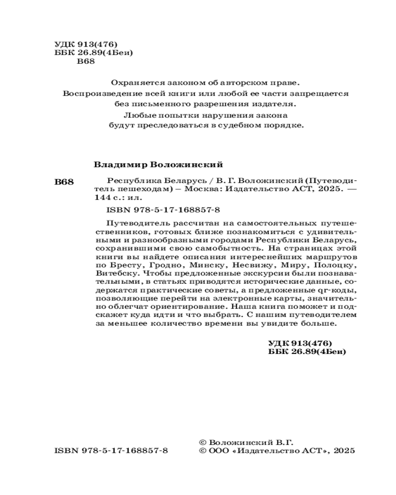 💳 Оплатить за товар можно при получении 🇰🇿 Есть бесплатная доставка по Казахстану от 1 дня 🎁 Копите бонусы с каждой покупки Серия: Путеводитель пешеходам Путеводитель рассчитан на самостоятельных путешественников, готовых ближе познакомиться с удивительными и разнообразными городами Республики Беларусь, сохранившими свою самобытность. На страницах этой книги вы найдете описания интереснейших маршрутов по Бресту, Гродно, Минску, Несвижу, Миру, Полоцку, Витебску, Могилеву, Гомелю. Чтобы предложенные экскурсии были познавательными, в статьях приводятся исторические данные, содержатся практические советы, а предложенные QR-коды, позволяющие перейти на электронные карты, значительно облегчат ориентирование. Наша книга поможет и подскажет, куда идти и что выбрать. С нашим путеводителем за меньшее количество времени вы увидите больше. |