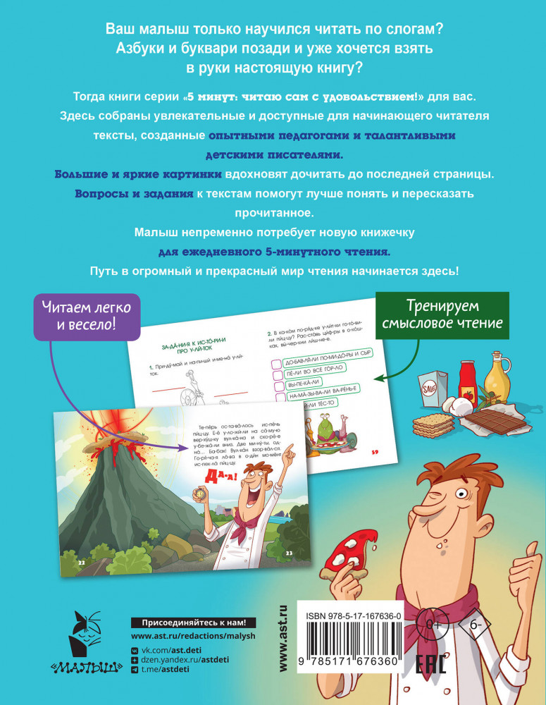 💳 Оплатить за товар можно при получении 🇰🇿 Есть бесплатная доставка по Казахстану от 1 дня 🎁 Копите бонусы с каждой покупки Серия: 5 минут: читаю сам с удовольствием! Первое самостоятельное чтение запоминается на всю жизнь! Книги серии «5 минут: читаю сам с удовольствием!» созданы специально для юных читателей, помогают им преодолеть страх большого текста и получить удовольствие от чтения. Короткие сказочные истории, простая и понятная ребёнку лексика и крупные яркие иллюстрации помогут сделать первые уверенные шаги в мир литературы. Все истории созданы опытными педагогами и талантливыми писателями с учётом возрастных особенностей детей. Вопросы и задания к текстам помогут лучше понять и пересказать прочитанное. Все слова поделены на слоги, проставлены ударения. Дети научатся понимать юмор и дружить, а также узнают рецепт волшебной пиццы. Читайте с удовольствием 5 минут в день! Для дошкольного и младшего школьного возраста. |