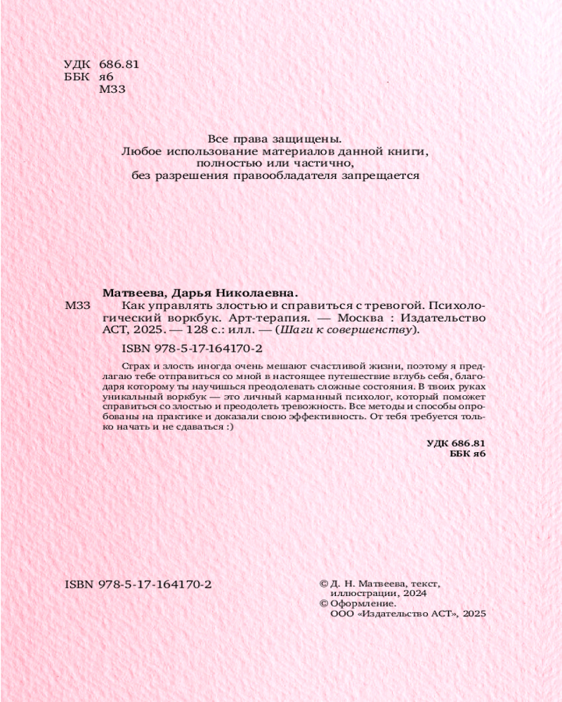💳 Оплатить за товар можно при получении 🇰🇿 Есть бесплатная доставка по Казахстану от 1 дня 🎁 Копите бонусы с каждой покупки Серия: Шаги к совершенству Дарья Николаевна Матвеева — дипломированный психолог, детский психолог с 19-летним опытом консультирования. Преподаватель, художник и писатель. |