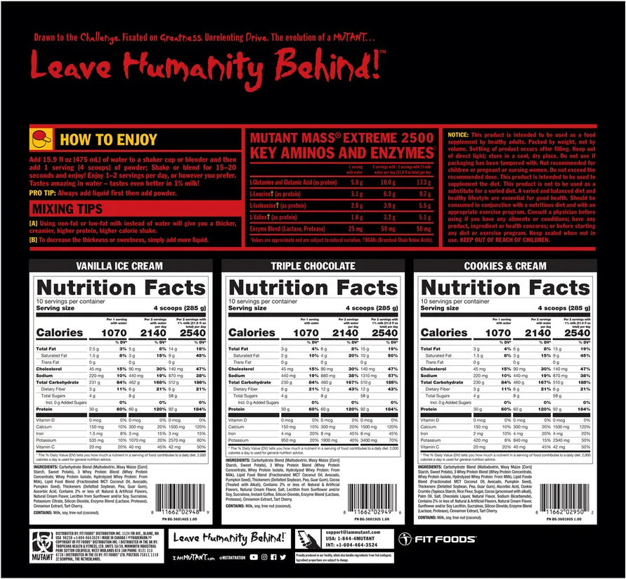 Mutant Mass XXXTreme 2500 содержит в 8 мерных ложках, смешанных с 1%-ым молоком: