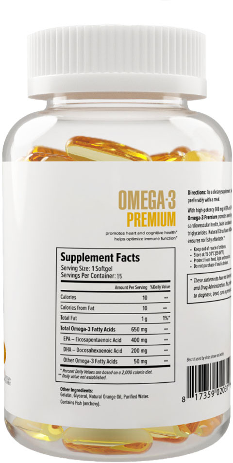 Omega-3 Premium содержит высокую концентрацию EPA/DHA — 400/200 — для общего здоровья организма, сердечно-сосудистого здоровья и мозговой деятельности. Натуральный цитрусовый вкус сделает прием продукта еще более приятным, помогая избежать рыбного послевкусия.