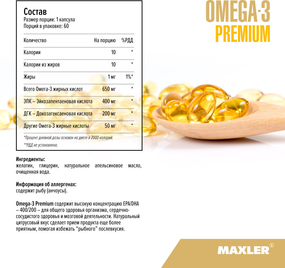 Потребление достаточного количества омега-3 несет огромную пользу организму. Попробуйте включить в свой рацион больше морепродуктов, рыбы или орехов. Но если вы хотите дополнить свой рацион или легче достигать поставленных целей, воспользуйтесь одной из специальных добавок. В Maxler Omega-3 Premium отличный цитрусовый вкус сочетается с оптимальной дозой высококачественных омега-3.