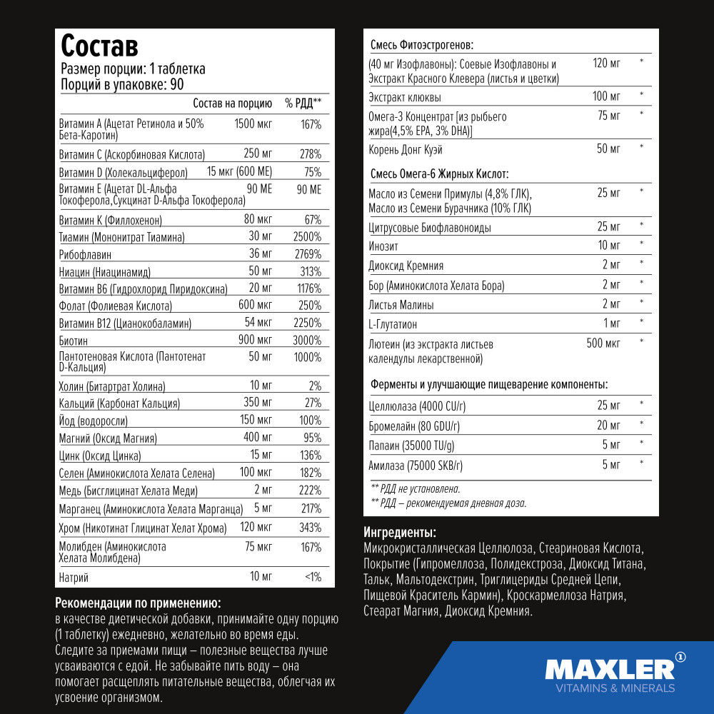 Maxler Витаминно-минеральный комплекс для женщин «Vita women»В данный момент этот товар отсутствует в продаже. Возможно, у нас найдется аналогичный или похожий товар здесь. Vita Women от Maxler — это уникальный витаминный комплекс, разработанный с учетом потребностей женщин, которые ведут активный образ жизни, регулярно посещают тренажерный зал или профессионально занимаются спортом. Эта пищевая добавка универсальна и подойдет для дам любого возраста. |