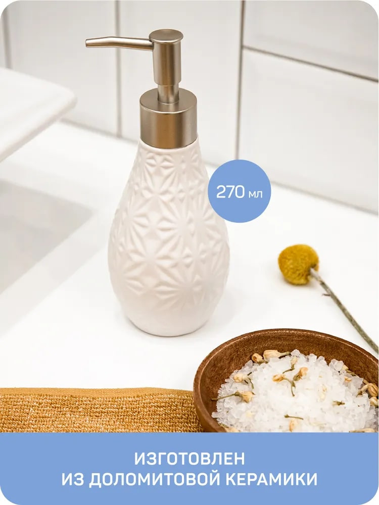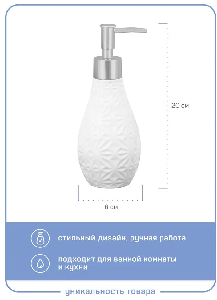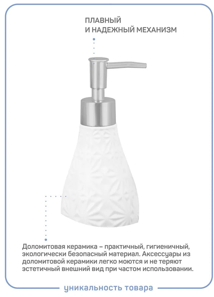 💳 Оплатить за товар можно при получении 🇰🇿 Есть бесплатная доставка по Казахстану от 1 дня 🎁 Копите бонусы с каждой покупки Серия: White Благодаря эффектному сочетанию четкого геометрического узора на белой керамике и поверхности кнопки дозатора в цвете матовое серебро аксессуар гармонично впишется как в современный, так и в классический интерьер. |