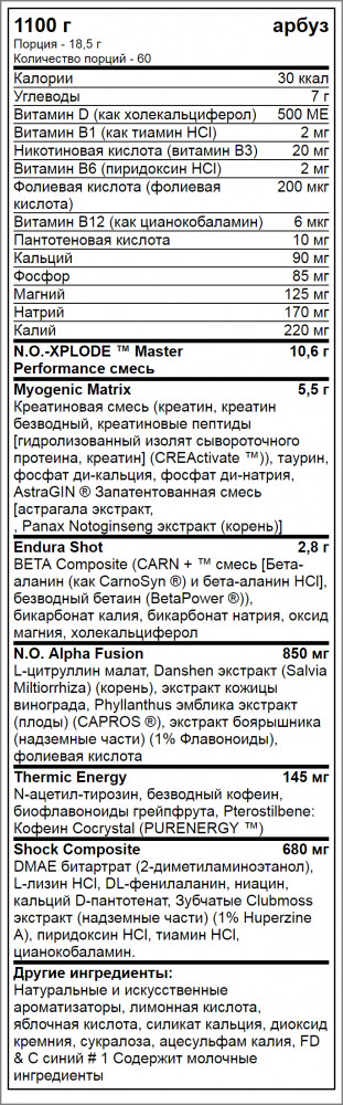 N.O. Alpha Fusion: L-цитруллин малат, Danshen экстракт (Salvia Miltiorrhiza) (корень), экстракт кожицы винограда, Phyllanthus эмблика экстракт (плоды) (CAPROS @), экстракт боярышника (надземные части) (1% Флавоноиды), фолиевая кислота.