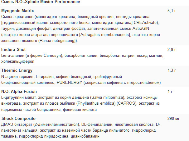 N.O. Alpha Fusion: L-цитруллин малат, экстракт корня даншена (Salvia miltiorrhiza), экстракт кожицы винограда, экстракт плодов эмблики (Phyllanthus emblica) (CAPROS), экстракт из надземных частей боярышника, фолиевая кислота.