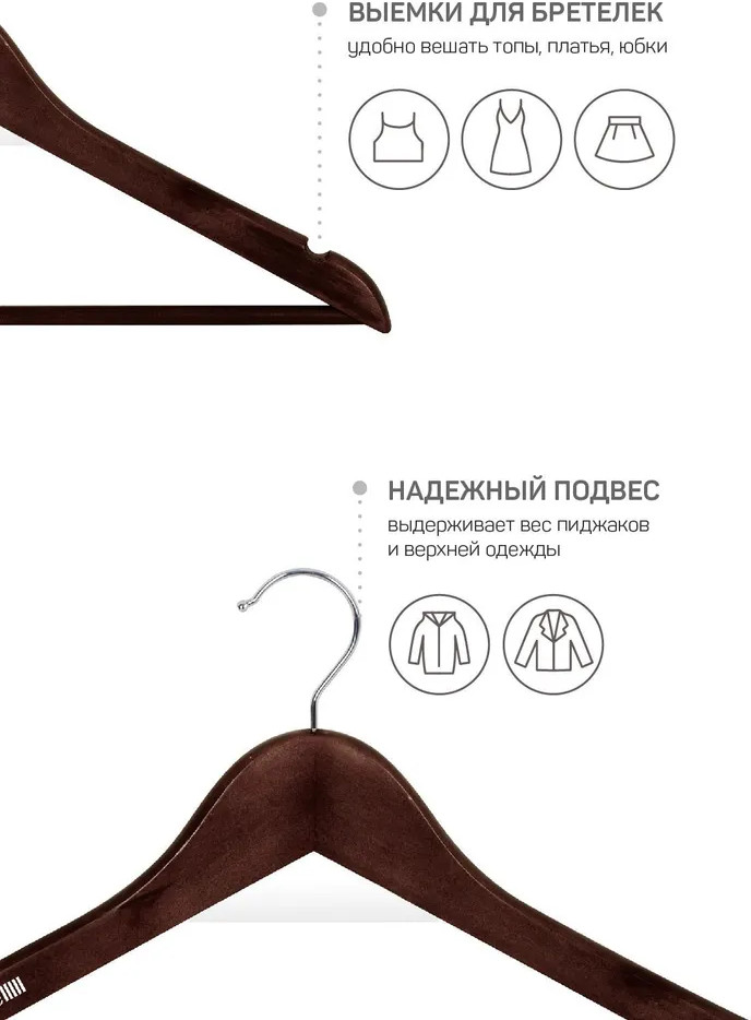 • выемки для бретелей позволят разместить платья и бельевые топы, сарафаны и майки. Так же, можно использовать для ремней или платков. Таким образом, можно собирать на плечиках полный образ и экономить время на сборы;
