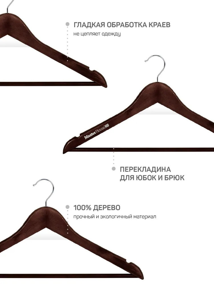 • натуральный и прочный материал: изготовлены из качественной древесины лотоса А класса, покрыты сверху белой краской. Древесина также обеспечивает прочность и долговечность плечиков, позволяя им выдерживать вес различных типов нарядов без значительных деформаций. Краска оберегает как тремпель, так и ткань от повреждений, обеспечивает дополнительную гладкость краев, при этом, одежда хорошо удерживается на аксессуаре;