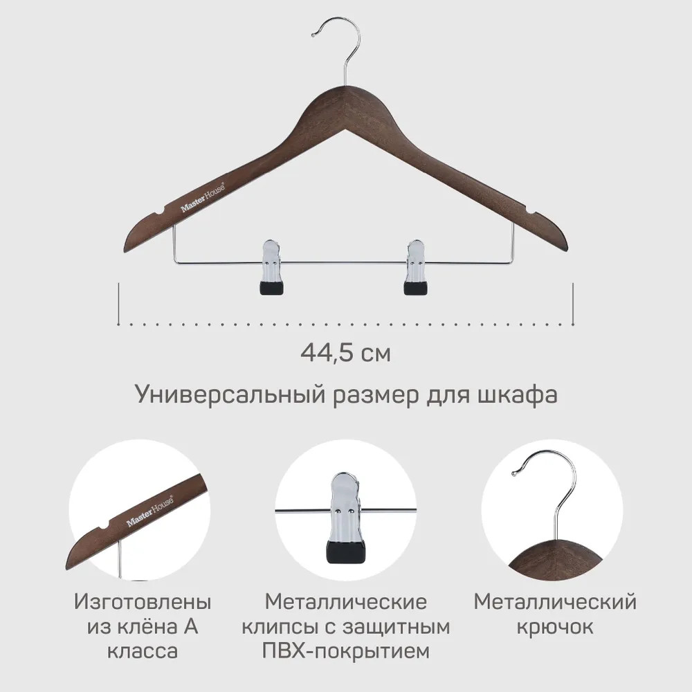 Деревянные прямые плечики с зажимами на металлической перекладине, подвижным хромированным крючком и выемками под бретели – незаменимый аксессуар в шкафу или гардеробной системе хранения. Удобный и функциональный элемент для организации одежды на платяной штанге для взрослых, подростков и детей.