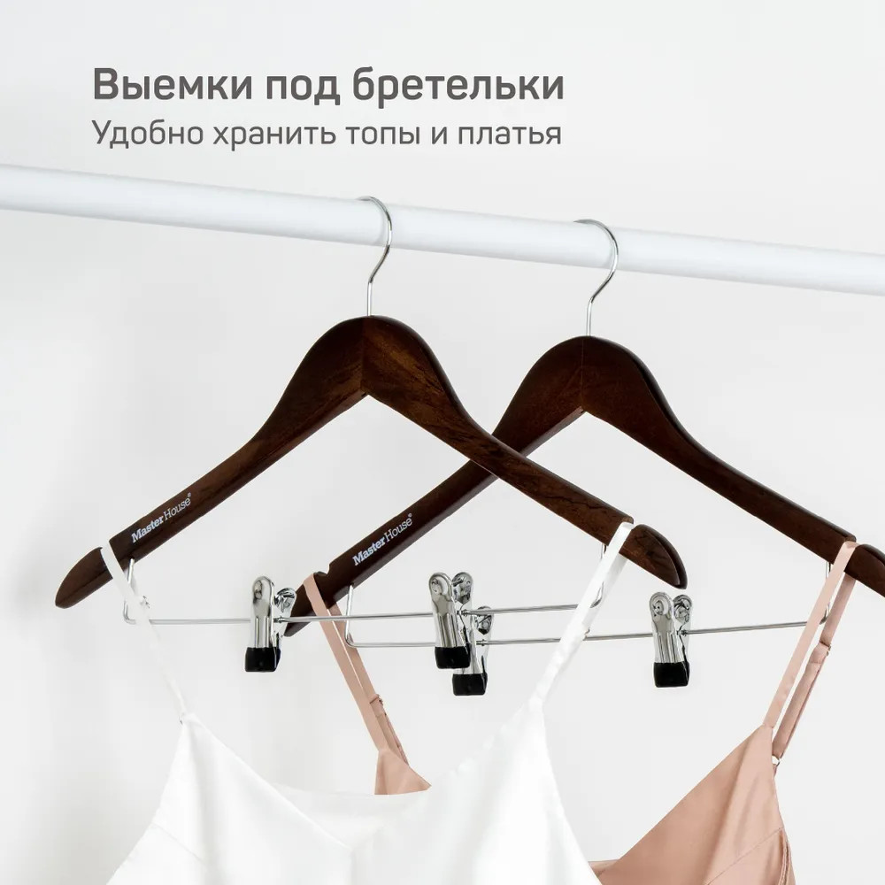 • выемки для бретелей позволят разместить платья и бельевые топы, сарафаны и майки. Так же, можно использовать для ремней или платков. Таким образом, можно собирать на плечиках полный образ и экономить время на сборы;