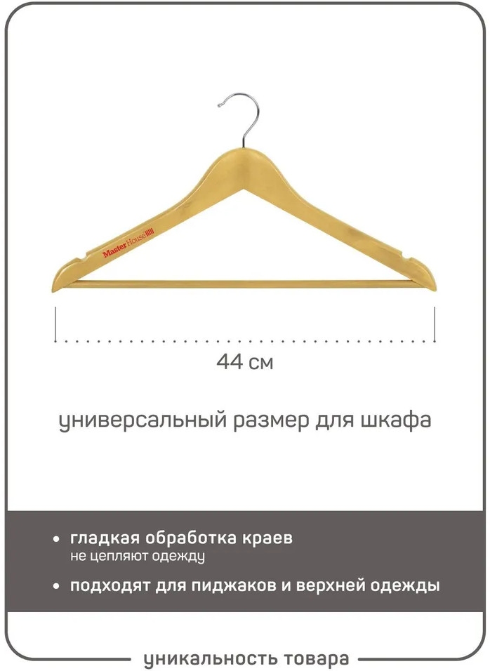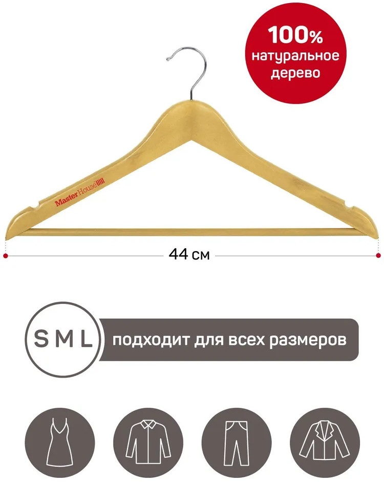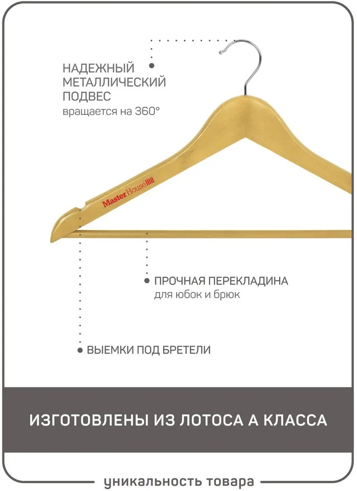 • натуральный и прочный материал: изготовлены из качественной древесины лотоса А класса, покрыты сверху прозрачным лаком. Древесина также обеспечивает прочность и долговечность плечиков, позволяя им выдерживать вес различных типов нарядов без значительных деформаций. Лак оберегает как тремпель, так и ткань от повреждений, обеспечивает дополнительную гладкость краев, при этом, одежда хорошо удерживается на аксессуаре;