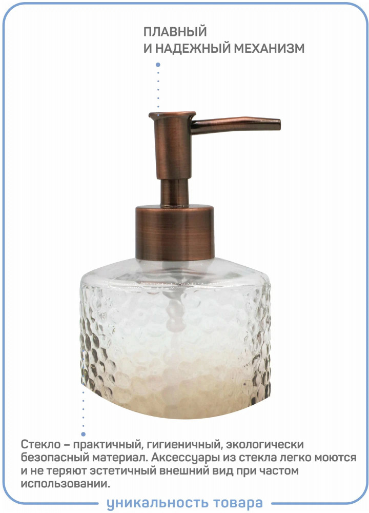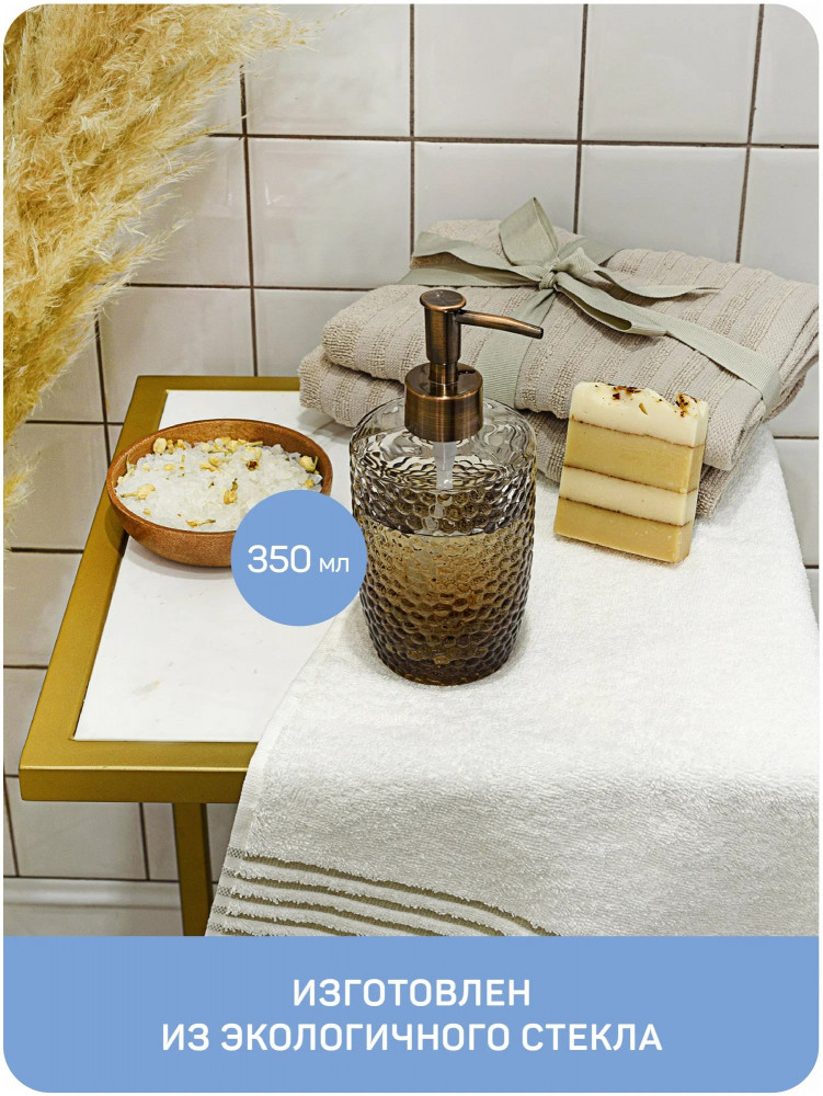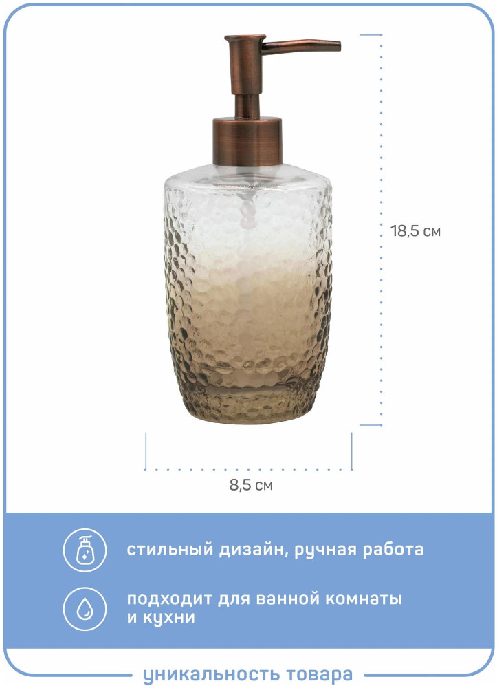 💳 Оплатить за товар можно при получении 🇰🇿 Есть бесплатная доставка по Казахстану от 1 дня 🎁 Копите бонусы с каждой покупки Серия: Vintage Дозатор для жидкого мыла Vintage выполнен из прозрачного коричневого стекла повышенной прочности с рельефным рисунком. |