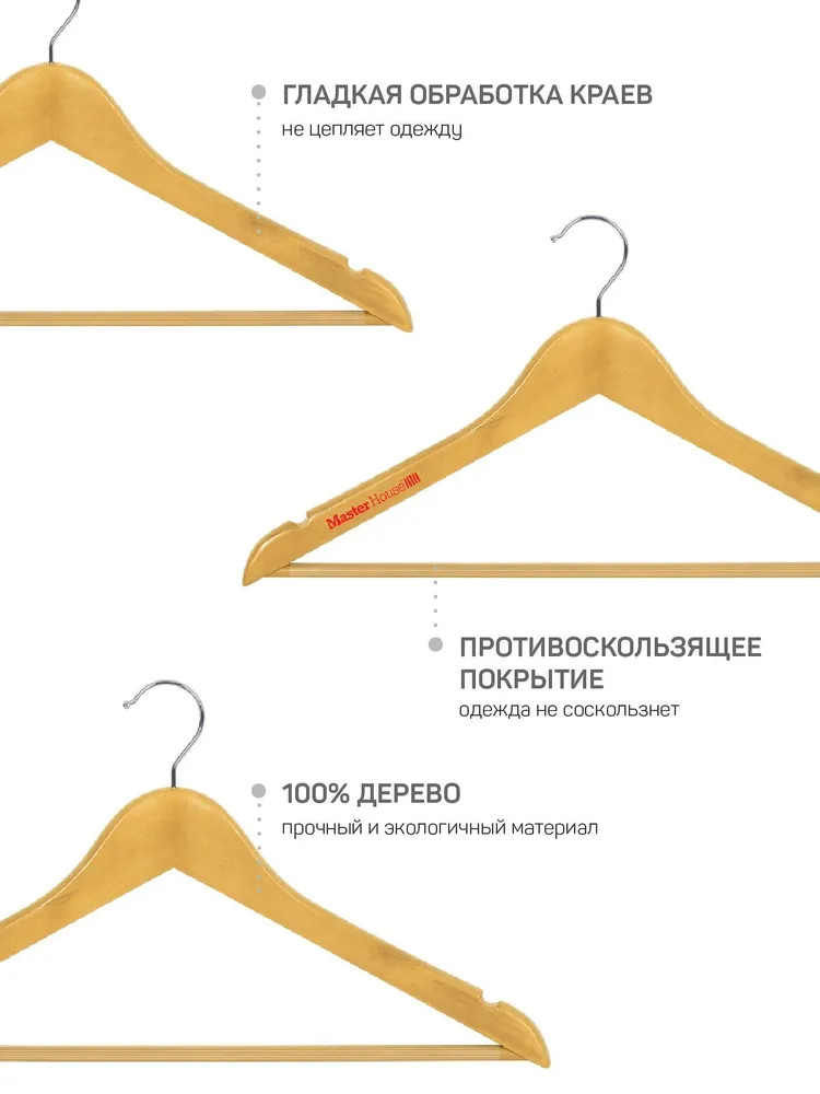 • натуральный и прочный материал: изготовлены из качественной древесины лотоса А класса, покрыты сверху прозрачным лаком. Древесина также обеспечивает прочность и долговечность плечиков, позволяя им выдерживать вес различных типов нарядов без значительных деформаций. Лак оберегает как тремпель, так и ткань от повреждений, обеспечивает дополнительную гладкость краев, при этом, одежда хорошо удерживается на аксессуаре;