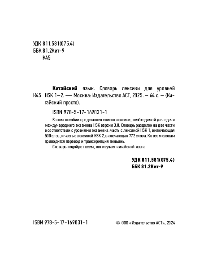 💳 Оплатить за товар можно при получении 🇰🇿 Есть бесплатная доставка по Казахстану от 1 дня 🎁 Копите бонусы с каждой покупки Серия: Китайский просто В этом пособии представлен список лексики, необходимой для сдачи международного экзамена HSK версии 3.0. Словарь разделен на две части в соответствии с уровнями экзамена: часть с лексикой HSK 1, включающая 500 слов, и часть с лексикой HSK 2, включающая 772 слова. Ко всем словам приводится перевод и транскрипция пиньинь. Словарь подойдет всем, кто изучает китайский язык. |