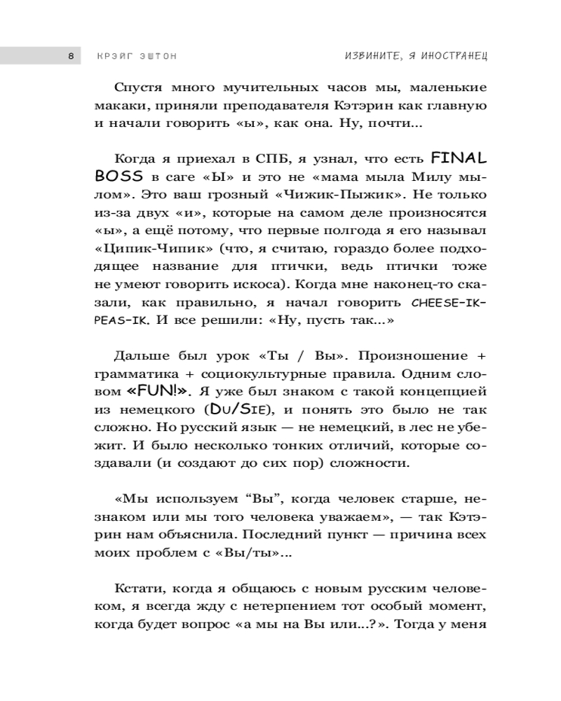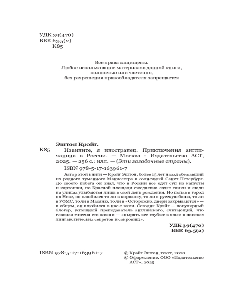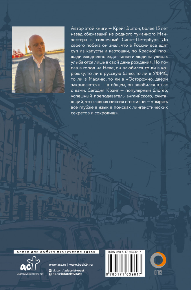 💳 Оплатить за товар можно при получении 🇰🇿 Есть бесплатная доставка по Казахстану от 1 дня 🎁 Копите бонусы с каждой покупки Серия: Эти загадочные страны Автор этой книги — Крэйг Эштон, более 15 лет назад сбежавший из родного туманного Манчестера в солнечный Санкт-Петербург. До своего побега он знал, что в России все едят суп из капусты и картошки, по Красной площади ежедневно ездят танки и люди на улицах улыбаются лишь в свой день рождения. Но попав в город на Неве, он влюбился то ли в корюшку, то ли в русскую баню, то ли в УФМС, то ли в Масяню, то ли в «Осторожно, двери закрываются» — в общем, он влюбился в нас с вами. Сегодня Крэйг — популярный блогер, успешный преподаватель английского, считающий, что главная миссия его жизни — «нырять всё глубже в язык в поисках лингвистических секретов и сокровищ». |