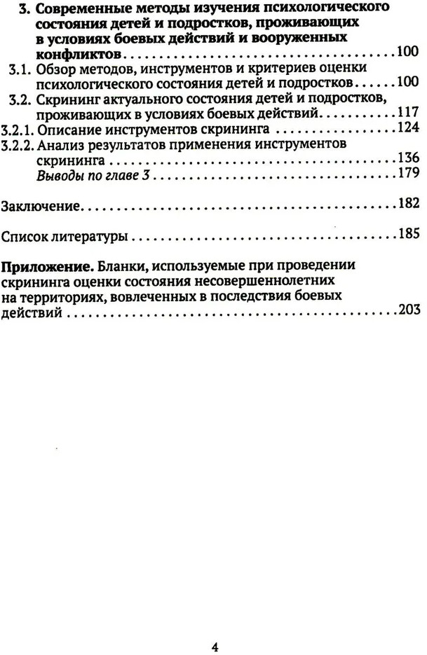 Монография содержит в себе описание инструментов разработанного скрининга состояния несовершеннолетних, находящихся на территориях, вовлеченных в последствия боевых действий, а также сами инструменты. Данный инструментарий позволяет получить комплексный взгляд на ситуацию травмирующего события: через призму самого ребенка, родителя (законного представителя) и педагогического работника, что способствует формированию целостной картины и создает надежный фундамент для оказания детям и подросткам психологической помощи. Приведены результаты апробации указанного инструментария в ряде субъектов Российской Федерации, в ходе которой были получены данные о факторах риска и психологических ресурсах обучающихся для совладения со стрессом в психофизиологической, эмоциональной, когнитивной, поведенческой, коммуникативной сферах жизнедеятельности, а также о степени социально-психологической вовлеченности детей и подростков в экстремальные ситуации на территориях, вовлеченных в последствия боевых действий.
