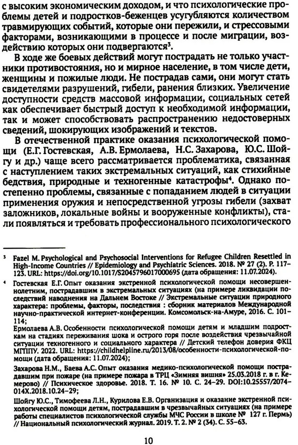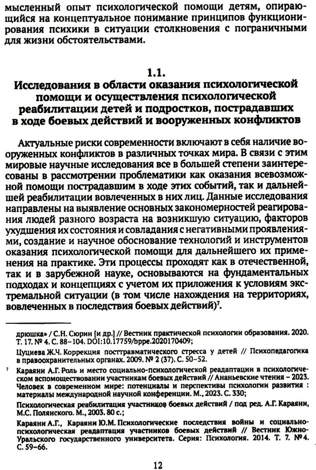 В представленной монографии рассматриваются теоретические и практические вопросы оказания психологической помощи детям и подросткам, находящимся на территориях, вовлеченных в последствия боевых действий. Определены основные подходы к проведению психологической диагностики и оказанию психологической помощи несовершеннолетним в отечественной и зарубежной науке. Отдельно изучены современные методы оценки психологического состояния детей и подростков, проживающих в условиях боевых действий и вооруженных конфликтов.