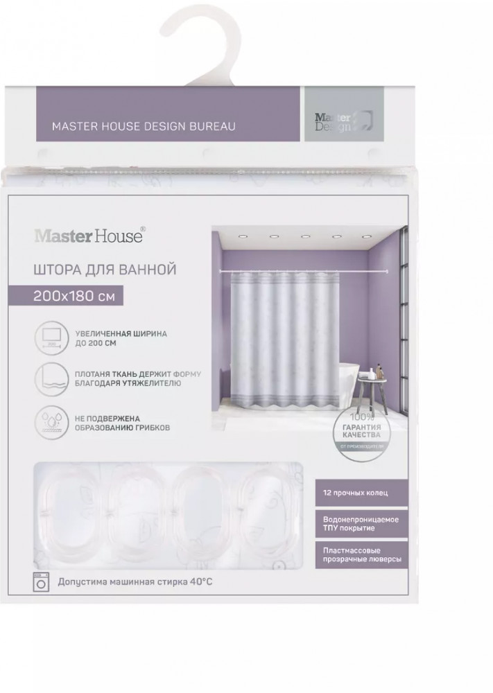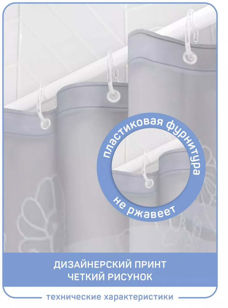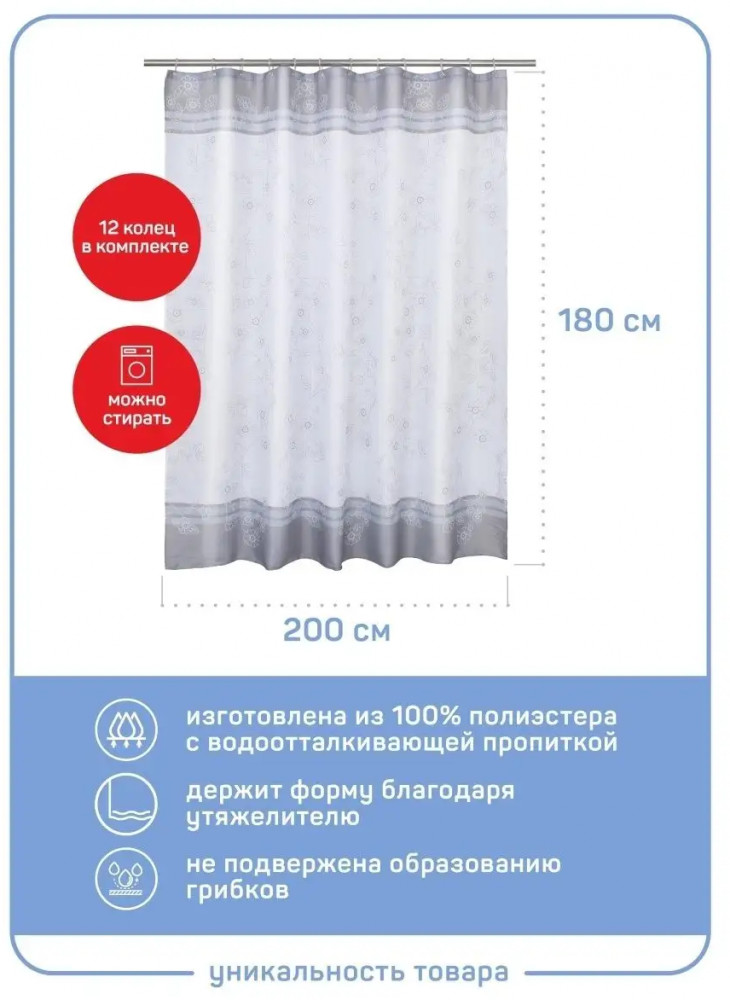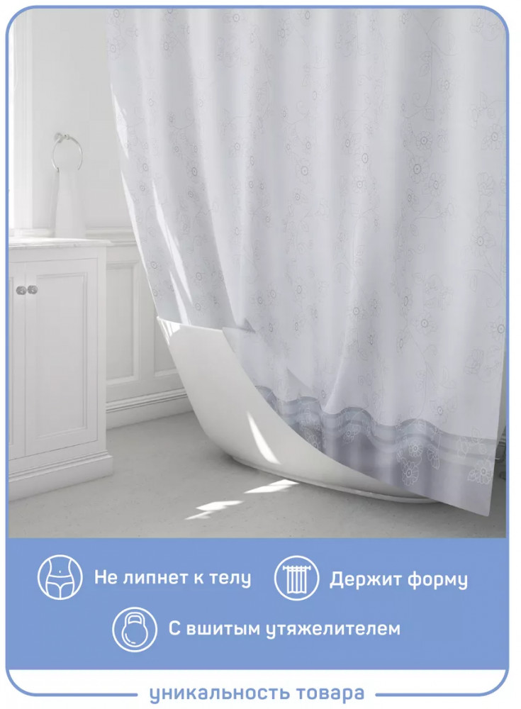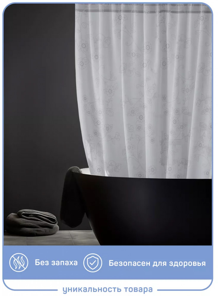 Тканевая белая шторка для ванной с серым рисунком 200×180см (увеличенная ширина 200, 180 высота). Прозрачная пластиковая фурнитура и 12 колец в комплекте — не ржавеет и не портит шторку. Полиэстер — полимерный материал со структурой плетения. Его можно стирать в стиральной машине и гладить при низких температурах. Есть утяжелитель. Широкая, подходит для большего количества помещений. Оптимальный размер водоотталкивающего и водонепроницаемого текстильного барьера, отдаляющего зону душа от общей площади комнаты. Не токсична, с пропиткой от плесени, делает ванную сухой, чистой и нарядной. Занавес держит форму, не липнет, красиво ложится складками или струится ровным полотном. Ткань шторы в ванную плотная по плетению. Декор спокойный — белый фон с серыми элементами и цветочным рисунком. |
