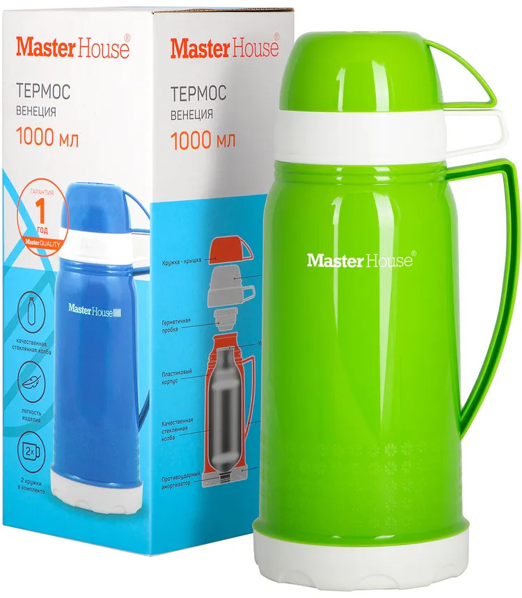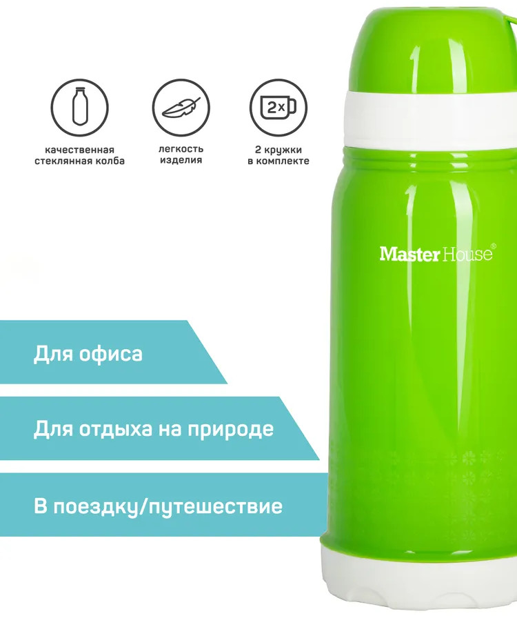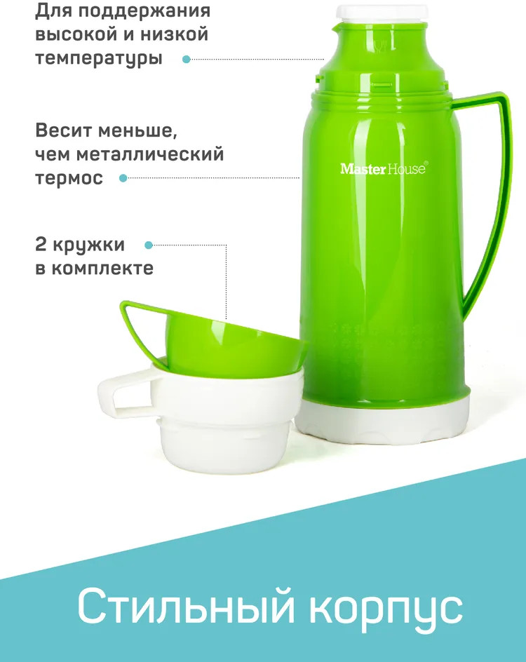 Термос для чая с качественной стеклянной колбой. Две кружки в комплекте. Качественная стеклянная колба не впитывает запахи. Легкость изделия: весит меньше, чем металлический термос. Температура напитка сохраняется в течение 6-8 часов в зависимости от температуры воздуха. Легкий и прочный — можно брать с собой в любые поездки. Две кружки в комплекте позволяют поделиться теплым питьем с близкими. Емкость термопосуды1 л идеальна для одного и для двоих. Колба из стекла экологична и безопасна для здоровья, вода в ней не приобретает лишних привкусов. Вес у пластикового термокувшина меньше, чем у металлического вакуумного аналога. Состоит из внешнего корпуса, колбы с противоударным амортизатором в основании, уплотнителя и герметичной пробки без клапана. Узкое горлышко с носиком, как у кувшина, позволит бережно налить чай, кофе, травяной напиток по кружкам, не пролив ни капли, сохранив тепло. Можно брать на работу в офис, в тренажерный зал для занятий спортом. Такая термопосуда будет полезна на рыбалке или охоте, спортивной велопрогулке, на походной кухне, в поездке на дачу, для активного отдыха на природе, пикника, в туристическом походе, рыболовном лагере, путешествии на автомобиле. Компактный туристический инвентарь обеспечит горячий напиток при низких температурах воздуха, и прохладную воду в летнюю жару.