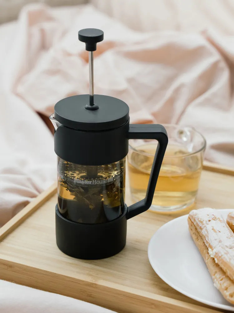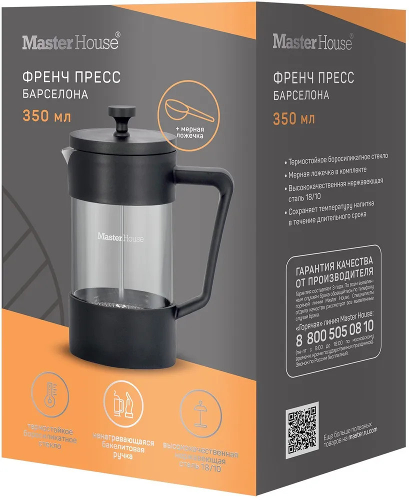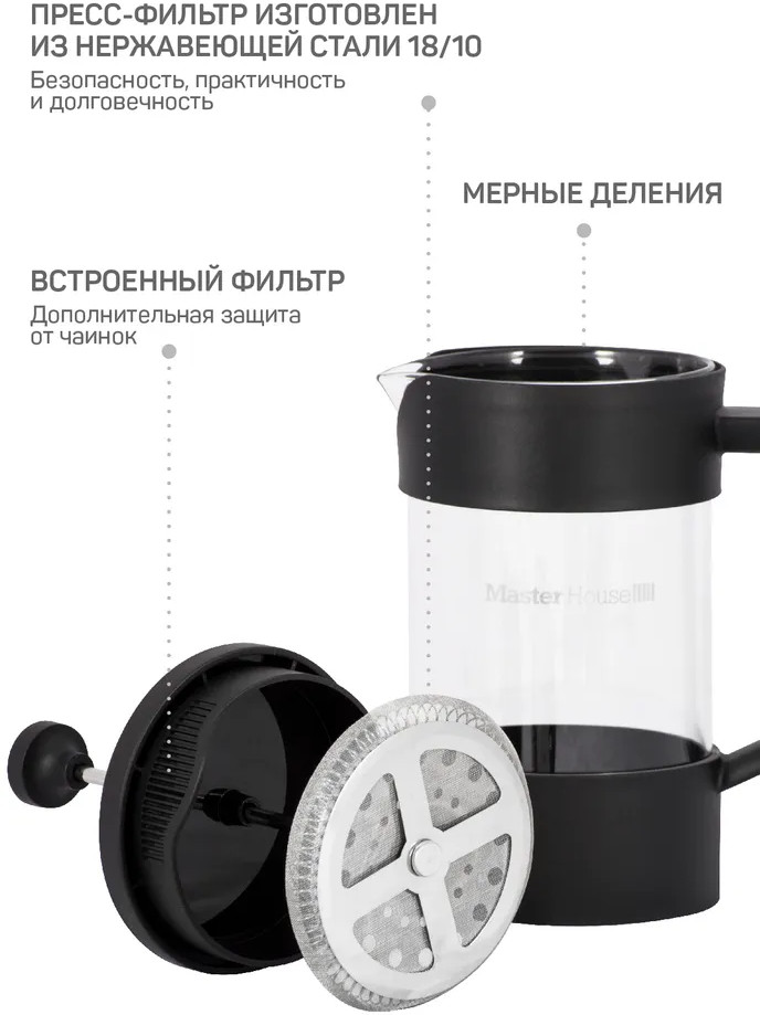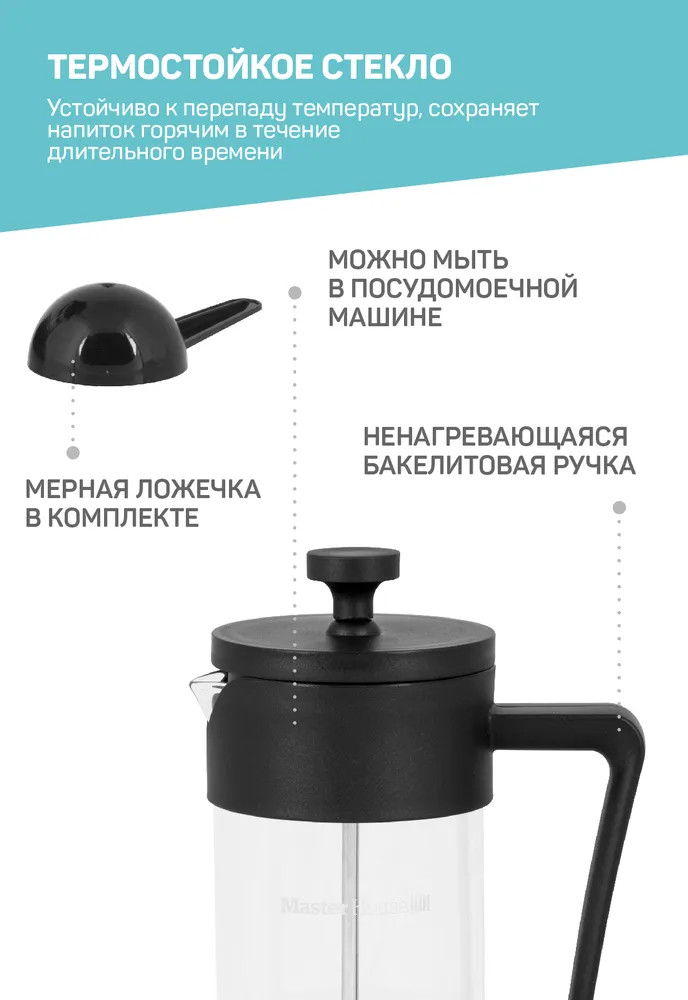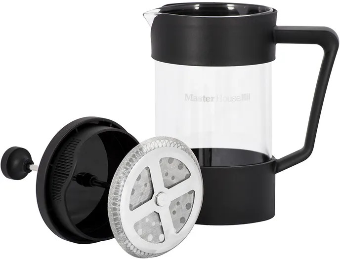 Френч-пресс Master House — отличное сочетание качества, функциональности и эстетики на вашей кухне. Ситечко и пресс выполнены из медицинской нержавеющей стали, которая не изменяет вкуса напитков. Ситечко плотно прилегает к стенкам колбы, поршень двигается мягко, без рывков. Колба изготовлена из термостойкого боросиликатного стекла, которое не трескается при нагревании и не выделяет вредных веществ при контакте с горячей водой. Такой заварочный чайник с прессом устойчив к царапинам, не мутнеет со временем. На колбу нанесена шкала уровня воды. Эргономичная не нагревающаяся ручка не скользит и идеально сидит в руке. Изделие легко моется, долго сохраняет привлекательный внешний вид. Разрешается использование в посудомоечной машине. В комплект входит мерная ложечка, которая позволяет точно отмерить нужное количество ингредиентов. Кроме того, френч-пресс можно использовать для заваривания не только листового чая, но и травяных настоев, кофе и других напитков, что делает его универсальным инструментом для приготовления различных напитков дома.