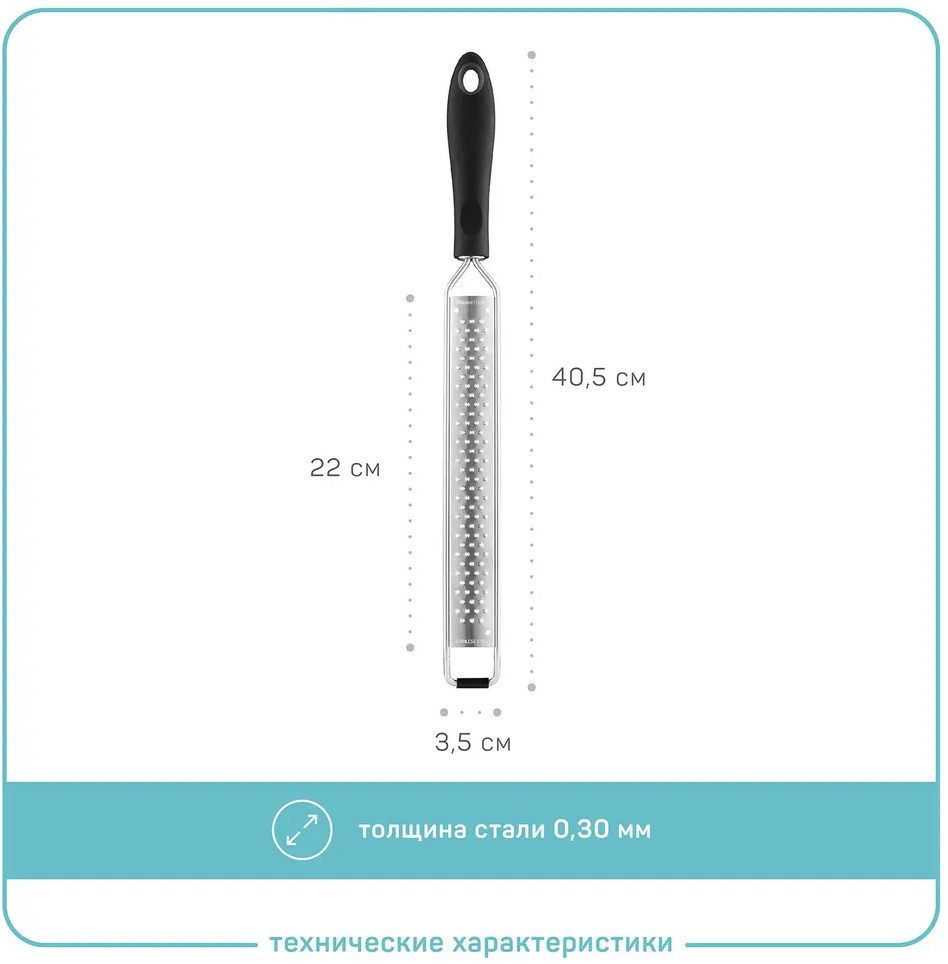 Универсальная мини-терка с одной гранью, с эргономичной ручкой, чехлом и антискользящим упором для быстрого измельчения сыра, специй, чеснока и снятия цедры. Форма — звездочка. Размер рабочей части 22 × 3.5см. Максимально простая в использовании, хранении и уходе. Шинковка выполнена из нержавеющей стали — аналога медицинской 18/10. Не окисляется, не ржавеет, не меняет свойства продуктов, не влияет на витамин С. Полностью безопасна для здоровья. Алмазная заточка позволяет легко справиться с жесткими продуктами.