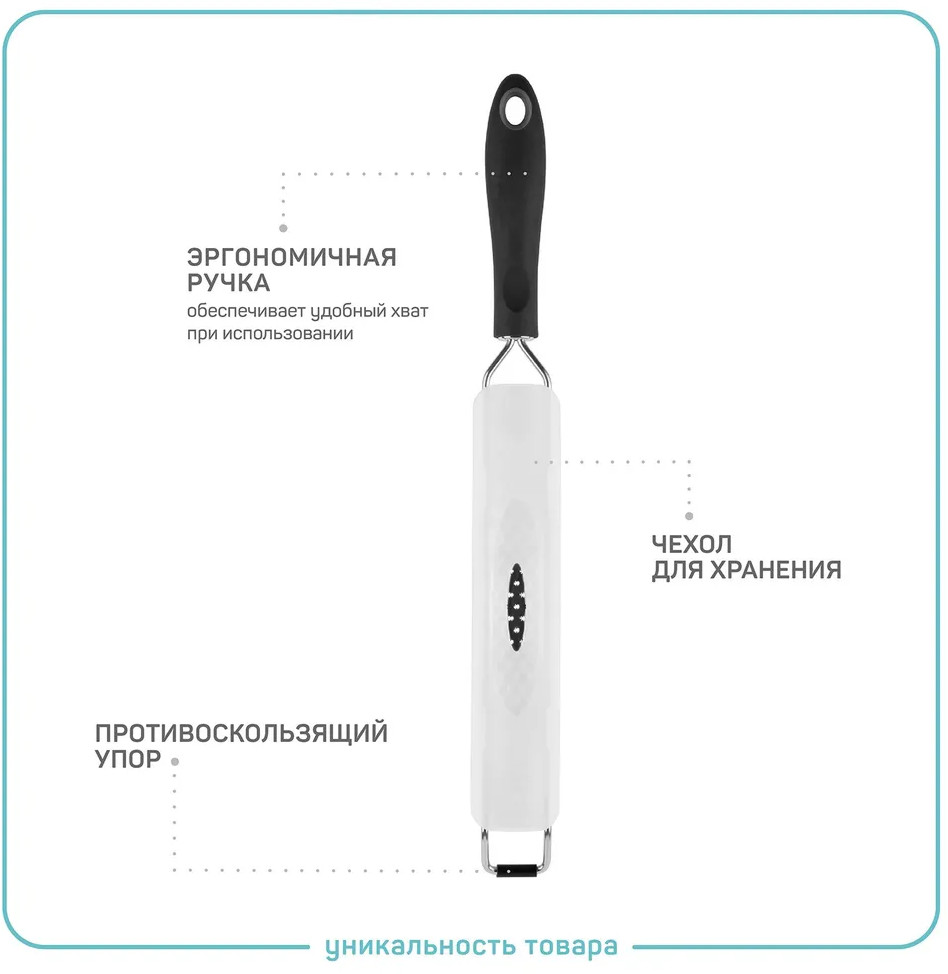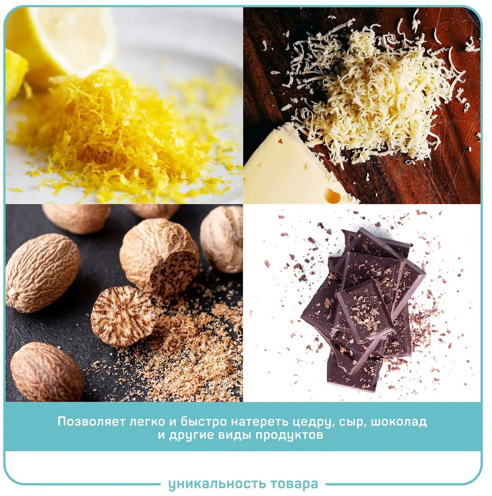 Измельчитель подойдет для имбиря и орехов, для чеснока, лука и овощей. Равномерно натереть твердый сыр, шоколад, кокос или мускатный орех для подачи, подготовить пюре для прикорма малышу или снять цедру с лимона и апельсина теперь легко. Удобно пользоваться на весу, не пачкая лишнюю посуду, при этом форма упора позволит надежно установить кухонный аксессуар над любой посудой для эффектной подачи. Возможно использовать как овощечистку. Удобная нескользящая ручка обеспечивает безопасную работу и бережет запястья. Усиленная рамка и увеличенная толщина шинковки обеспечат долговечность.