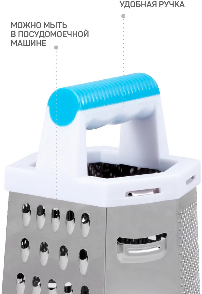 Измельчитель полностью нержавеющий, не имеет дополнительных элементов. При этом имеет эргономичную ручку: она не врезается в руку при усилии и отлично удерживает кухонный аксессуар на месте. Ручная тёрка максимально устойчива к износу и поломкам, не ржавеет. Образование грибка или плесени так же исключено. Сталь не впитывает запахов, вкусов, не красится от продуктов. Максимально неприхотлива в уходе: можно мыть в посудомойке.