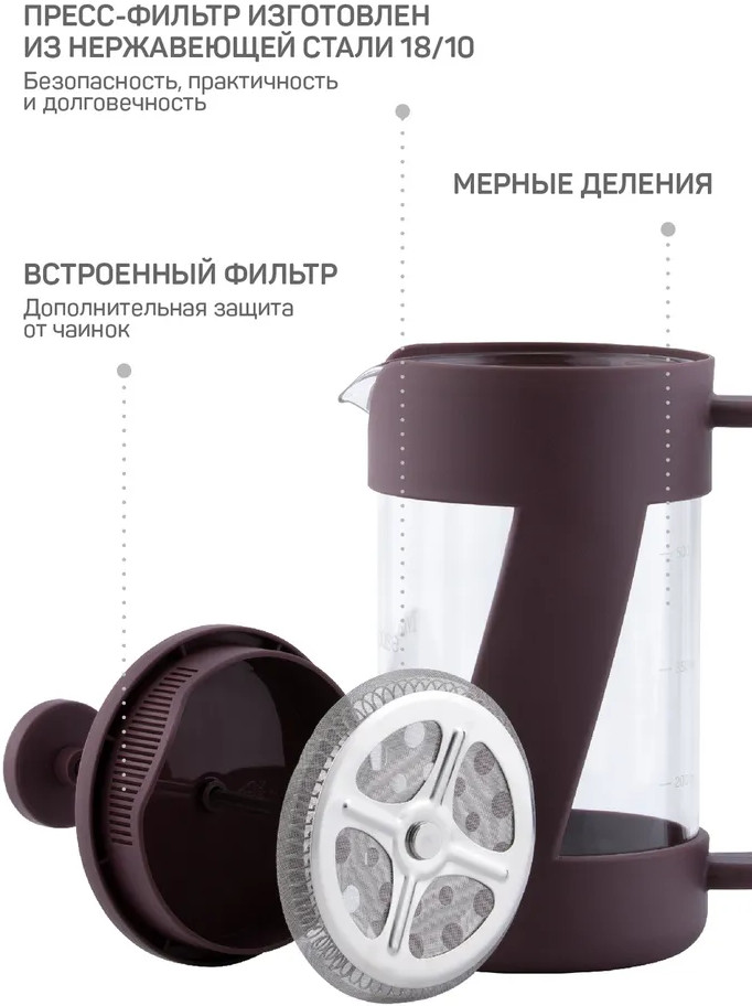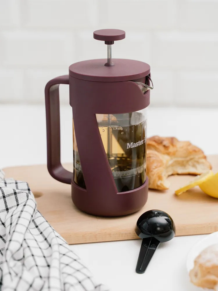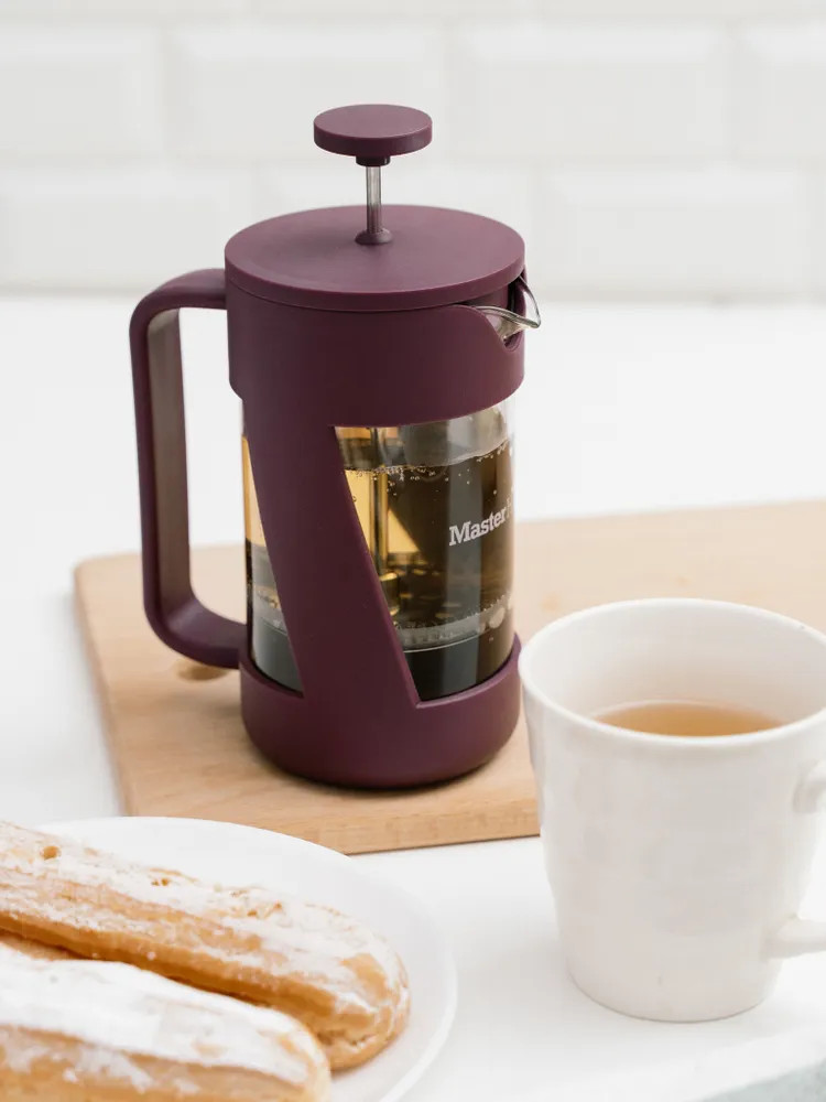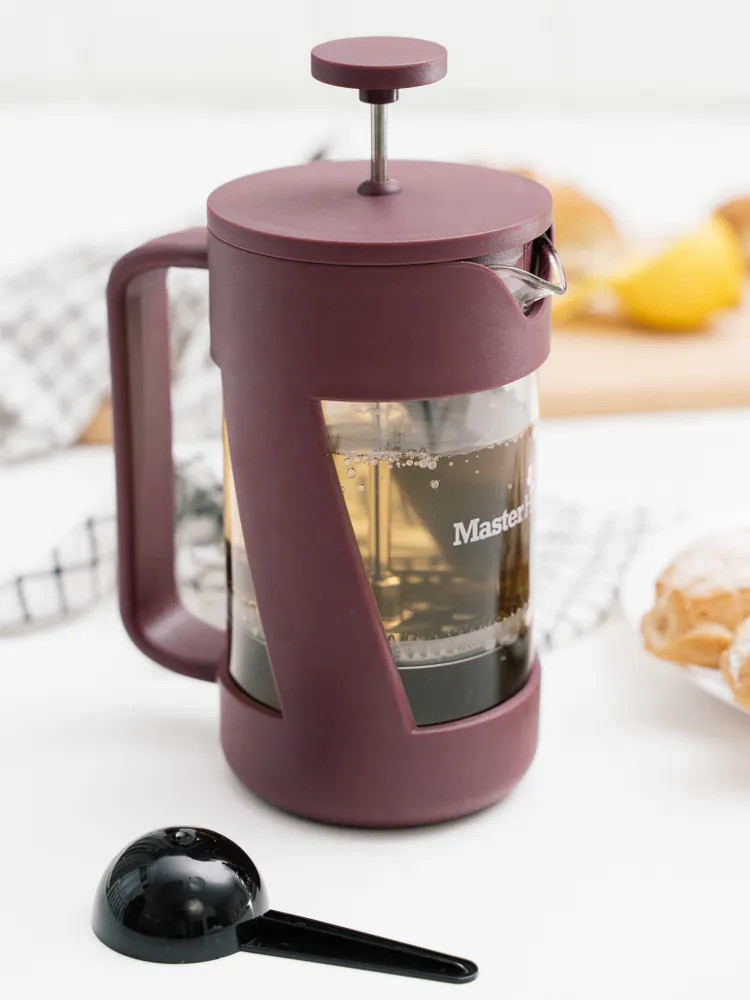 Френч-пресс Master House — отличное сочетание качества, функциональности и эстетики на вашей кухне. Ситечко и пресс выполнены из медицинской нержавеющей стали, которая не изменяет вкуса напитков. Ситечко плотно прилегает к стенкам колбы, поршень двигается мягко, без рывков. Колба изготовлена из термостойкого боросиликатного стекла, которое не трескается при нагревании и не выделяет вредных веществ при контакте с горячей водой. Такой заварочный чайник с прессом устойчив к царапинам, не мутнеет со временем. На колбу нанесена шкала уровня воды. Эргономичная не нагревающаяся ручка не скользит и идеально сидит в руке. Изделие легко моется, долго сохраняет привлекательный внешний вид. Разрешается использование в посудомоечной машине. В комплект входит мерная ложечка, которая позволяет точно отмерить нужное количество ингредиентов. Кроме того, френч-пресс можно использовать для заваривания не только листового чая, но и травяных настоев, кофе и других напитков, что делает его универсальным инструментом для приготовления различных напитков дома.