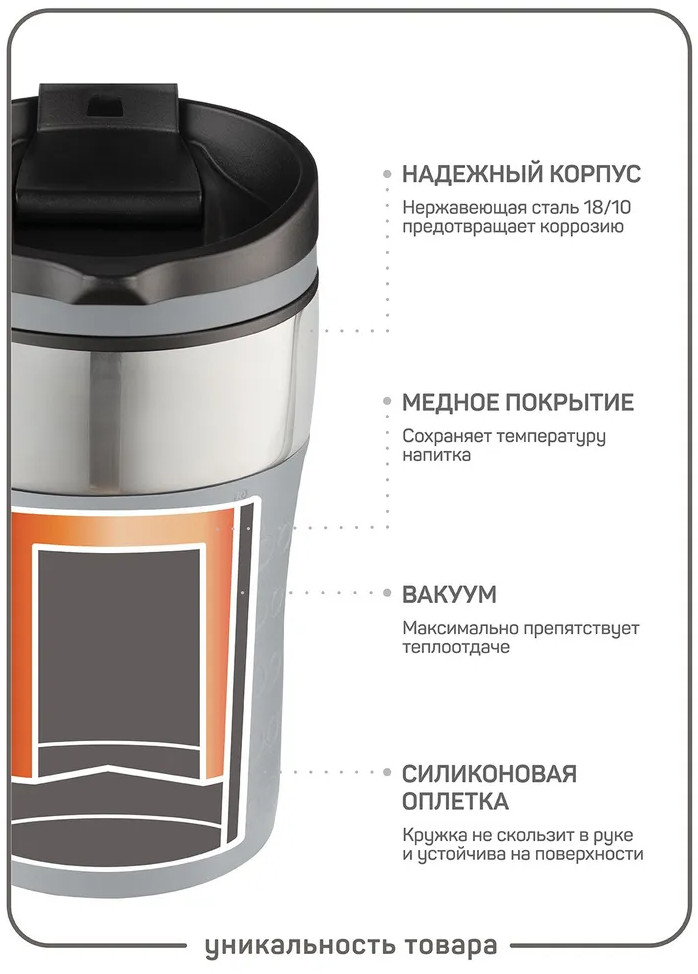 💳 Оплатить за товар можно при получении 🇰🇿 Есть бесплатная доставка по Казахстану от 1 дня 🎁 Копите бонусы с каждой покупки Термокружка Ipswich Мастер Хаус имеет надежный корпус. Нержавеющая сталь 18/10 предотвращает коррозию. Медное покрытие сохраняет температуру. Вакуум максимально препятствует теплоотдаче. После 3 часов температура горячего напитка не менее 50°С (тестирование проводилось при t воды 96°С и воздуха 21°С). С помощью удобной крышки, вы сможете насладиться кофе или чаем, не пролив ни капли. Крышка герметично закрывается, фиксируется при питье, легко моется. Безопасна для здоровья и не меняет вкус напитка. Многофункциональная. Может использоваться для заваривания полезных травяных настоев и сборов трав, ягод, чая и кофе с собой из дома, кофейни. Можно просить варить прямо в термо-стакан и беречь природу от мусора. |