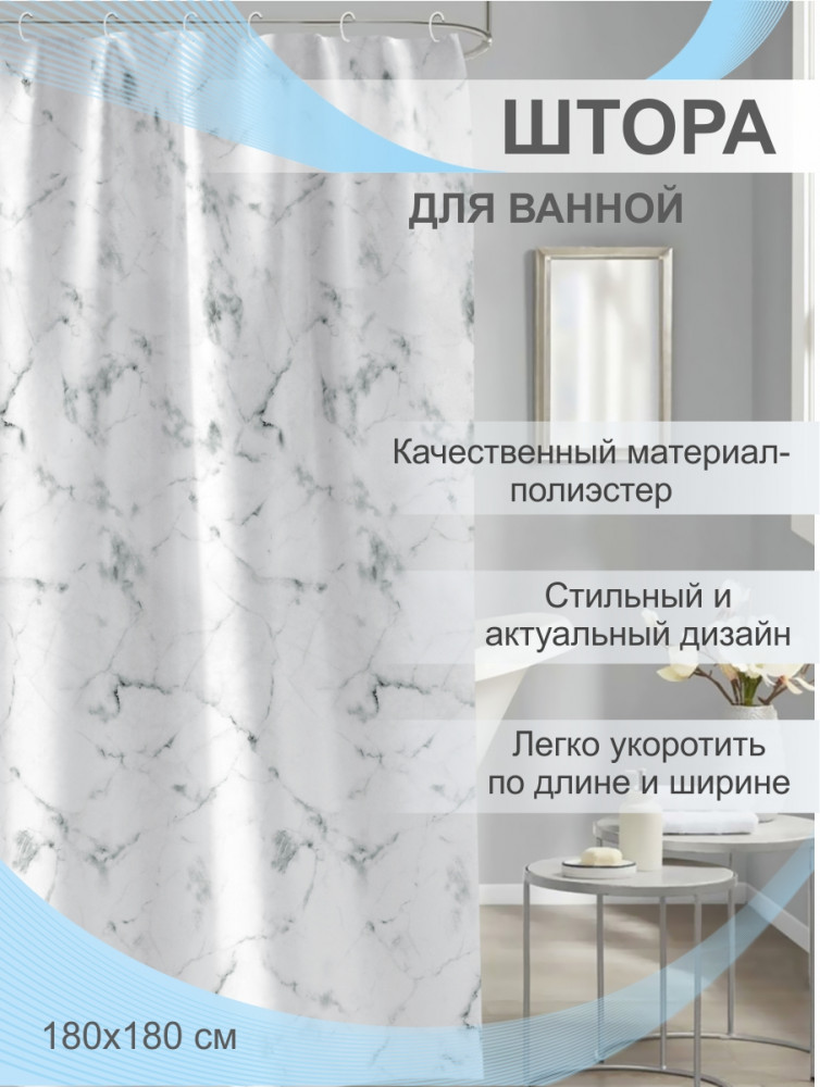 Delphinium Штора для ванной «Мрамор»В данный момент этот товар отсутствует в продаже. Возможно, у нас найдется аналогичный или похожий товар здесь. Штора для ванной — незаменимый и практичный аксессуар современной ванной. Шторы предотвращают попадание брызг воды, мыльной пены на пол и стены ванной комнаты. Штора для ванной имеет металлические люверсы (12 шт), которые защищают шторы от случайного разрыва в местах навешивания. В комплекте идут 12 пластиковых колец. Штора выполнена из водонепроницаемого материала — полиэстер. Он плотный, прочный, обладает водоотталкивающими свойствами, идеально подойдет для ванны, не тускнеет. |